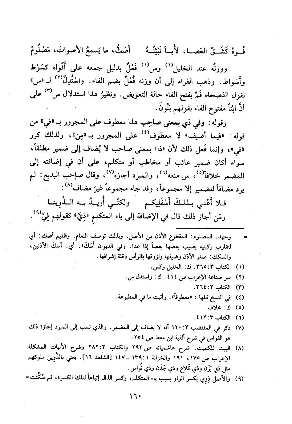 وقوله: وفي ذي بمعنى صاحب هذا معطوف على المجرور ب"في" من قوله: " فيما أضيف" لا معطوف على المجرور ب" من" ولذلك كرر "في"، وإنما فعل ذلك لأن "ذا" بمعنى صاحب لا يضاف إلى الضمير مطلقاً، سواء أكان ضمير غائب أو مخاطب أو متكلم، على أن في إضافته إلى المضمر خلافاً س منعه والمبرد أجازه، وقال صاحب البديع: لم يرد مضافاً للضمير إلا مجموعاً وقد جاء مجموعاً غير مضاف: