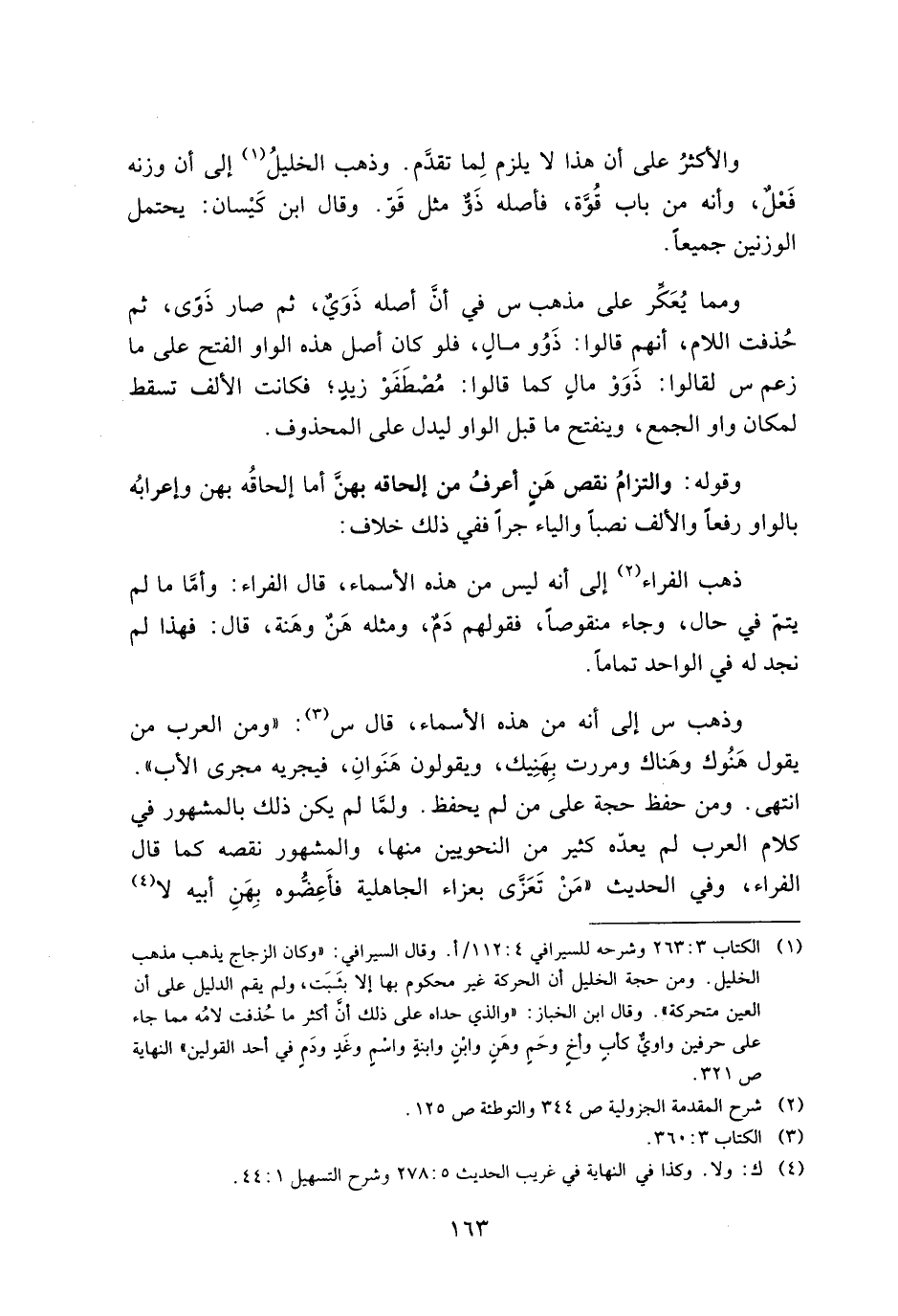 وذهب س إلى أنه من هذه الأسماء قال س: " ومن العرب من يقول هنوك وهناك ومررت بهنيك ويقولون هنوان، فيجريه مجرى الأب" انتهى. ومن حفظ حجة على من لم يحفظ ولما لم يكن ذلك بالمشهور في كلام العرب لم يعده كثير من النحويين منها والمشهور نقصه كما قال الفراء، وفي الحديث" من تعزى بعزاء الجاهلية فأغضوه بهن أبيه لا