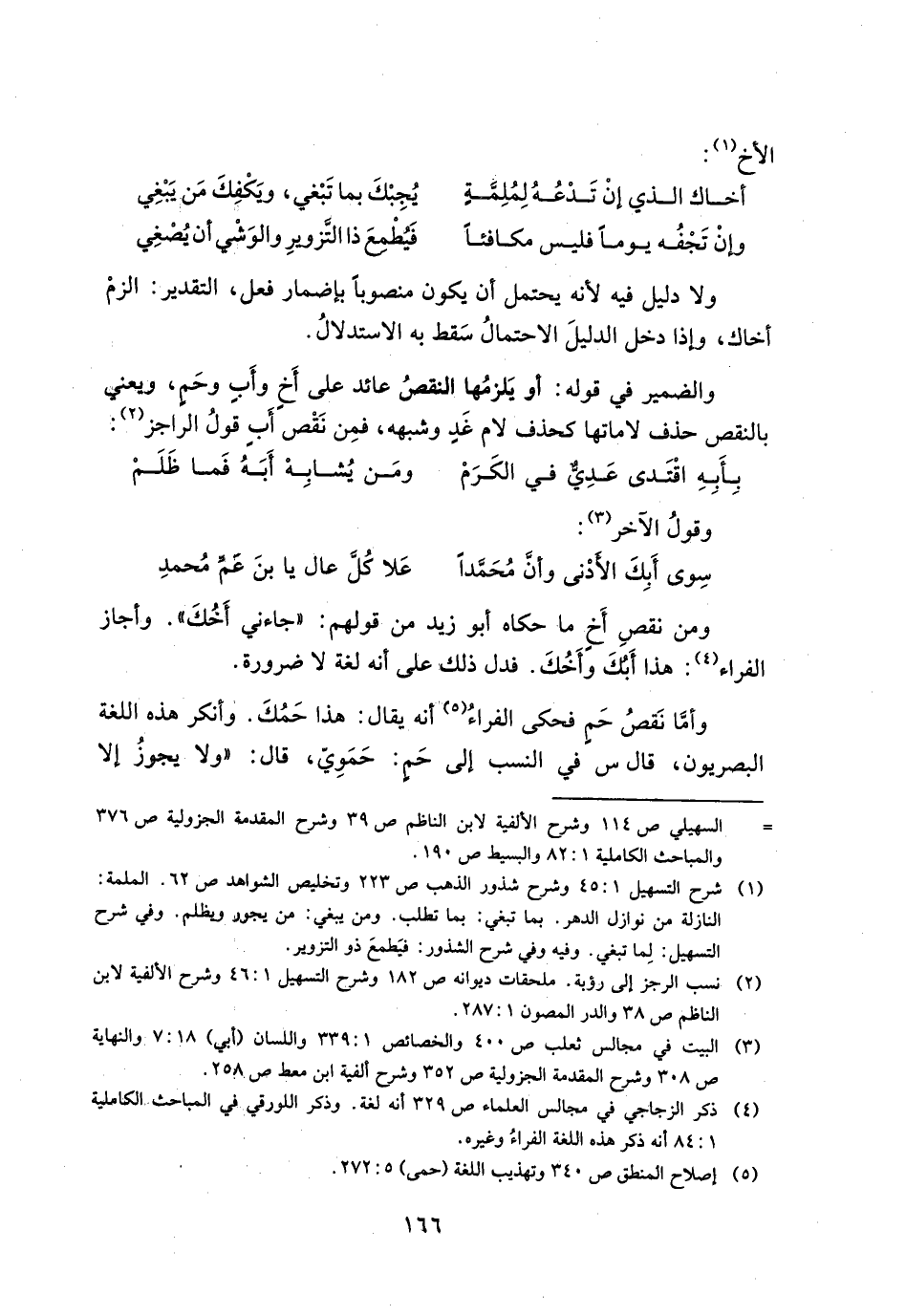 ومن نقص أخ ما حكاه أبو زيد من قولهم: " جاءني أخك". وأجاز الفراء: هذا أبك وأخك. فدل ذلك على أنه لغة لا ضرورة.
