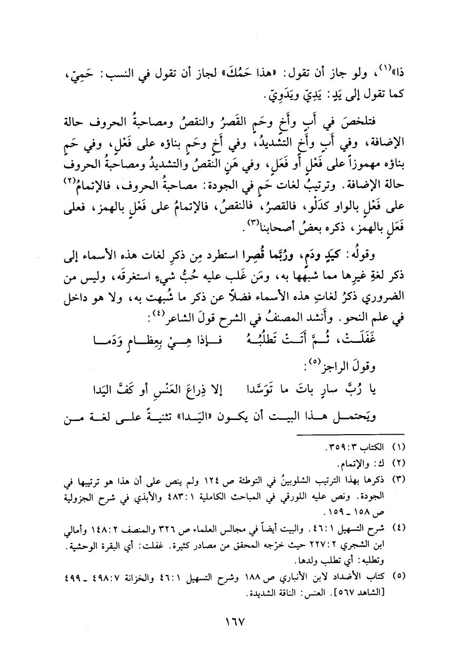 وقوله: كيد ودم، وربما قصرا استطرد من ذكر لغات هذه الأسماء إلى ذكر لغة غيرها مما شبهها به، ومن غَلب عليه حُبُّ شيء استغرقه، وليس من الضروري ذكر لغاتِ هذه الأسماء فضلاً عن ذكر ما شبهت به، ولا هو داخل في علم النحو. وأنشد المصنف في الشرح قولَ الشاعر: