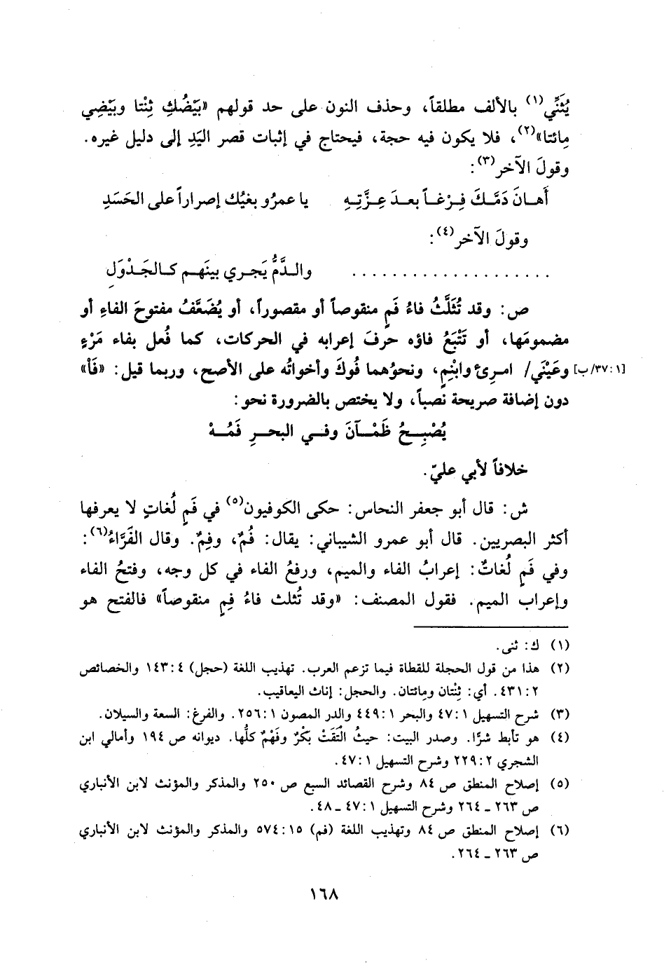 ش: قال أبو جعفر النحاس: حكي الكوفيون في فم لغات لا يعرفها أكثر البصريين. قال أبو عمرو الشيباني: يقال: فم، وفم، وقال الفراء: وفي فم لغات: إعراب الفاء والميم، ورفع الفاء في كل وجه، وفتح الفاء وإعراب الميم. فقول المصنف: " وقد تثلث فاء فم منقوصاً" فالفتح هو