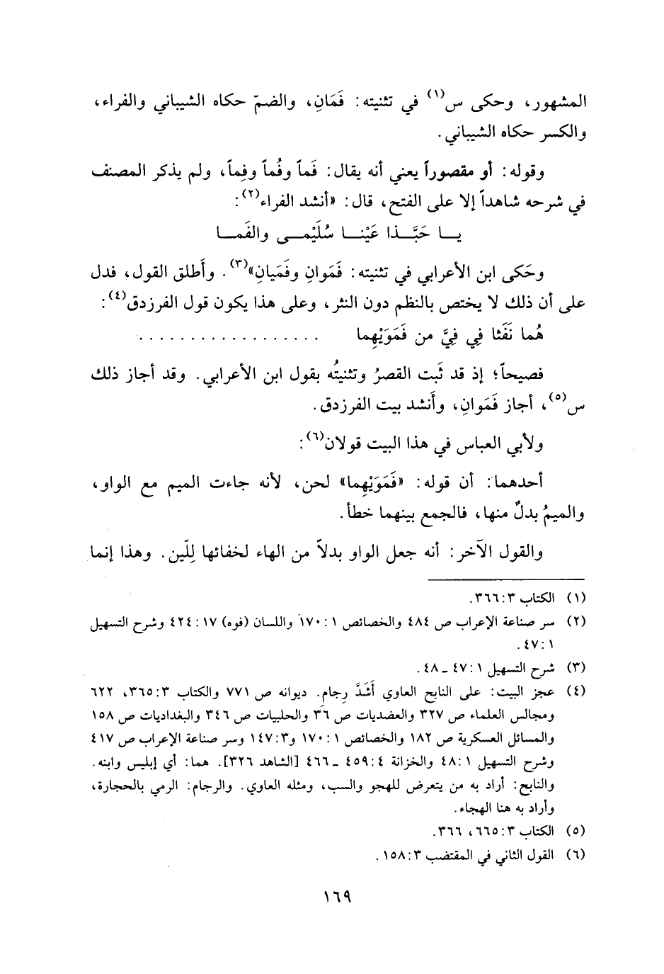 وحكي ابن الأعرابي في تثنيته: فموان وفميان". وأطلق القول، فدل على أن ذلك لا يختص بالنظم دون النثر وعلى هذا يكون قول الفرزدق: