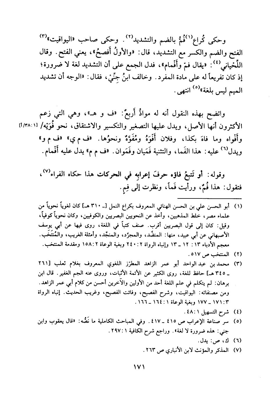 وحكى كراع فم بالضم والتشديد وحكي صاحب " اليواقيت" الفتح والضم والكسر مع التشديد، قال: " والأول أفصح" يعني الفتح، وقال اللحياني: " يقال فم وأفمام" فدل الجمع على أن التشديد لغة ضرورة، إذ كان تفريعاً على مادة المفرد. وخالف ابن جني فقال: " الوجه أن تشديد الميم ليس بلغة" انتهى.