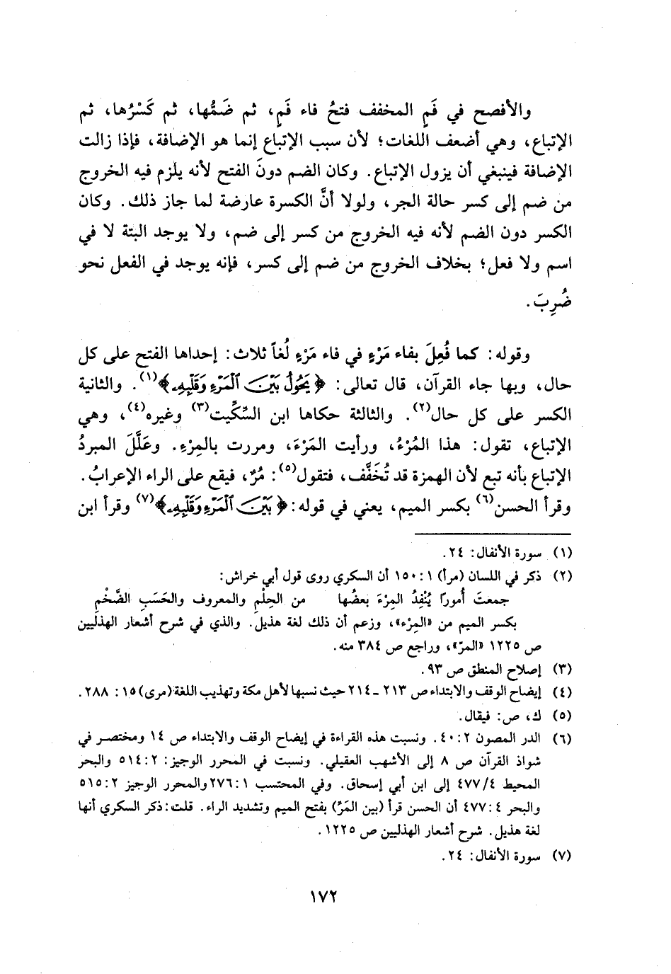 وقوله: كما فعل بفاء مريء لغا ثلاث: إحداها الفتح على كل حال، وبها جاء القرآن قال تعالى: {يَحُولُ بَيْنَ الْمَرْءِ وَقَلْبِهِ} والثانية الكسر على كل حال. والثالثة حكاها ابن السكيت وغيره وهي الإتباع بأنه تبع لأن الهمزة قد تخفف، فتقول: مر، فيقع على الراء الإعراب وقرأ الحسن بكسر الميم، يعني في قوله: {بَيْنَ الْمَرْءِ وَقَلْبِهِ} وقرأ ابن