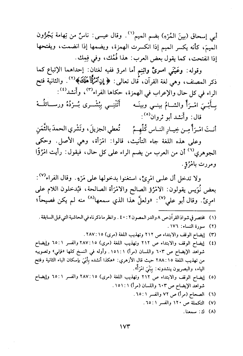 ولا تدخلا أل على امرئ استغنوا بدخولها على مريء. وقال الفراء بعض نويس يقولون: الامرؤ الصالح وإلا مرآة الصالحة فيدخلون اللام على امرئ. وقال أبو علي: " ولعل هذا الذي سمعها منه لم يكن فصيحاً.