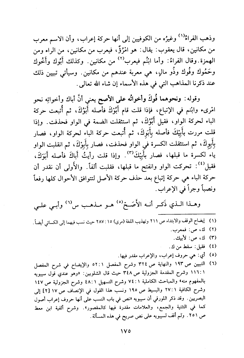 وقوله: ونحوهما فوك وأخواته على الأصح يعني أن أباك وأخواته نحو امرئ وابنم في الإتباع، فإذا قلت قام أبوك فأصله أبوك ثم أتبعت حركة الباء لحركة الواو، فقيل أبوك ثم استثقلت الضمة في الواو فحذفت. وإذا قلت مررت بأبيك فأصله يأبوك ثم أتبعت حركة الباء لحركة الواو، فصار بأبوك ثم استثقلت الكسرة في الواو فحذفت، فصار بأبوك، ثم انقلبت الواو ياء لكسرة ما قبلها فصار بأبيك. وإذا قلت رأيت أباك فأصله أبوك، فقيل: تحركت الواو وانفتح ما قبلها، فقلبت ألفاً والأولى أن نقدر أن حركة الباء هي حركة إتباع بعد حذف حركة الأصل لتتوافق الأحوال كلها رفعاً ونصباً وجراً في الإعراب.