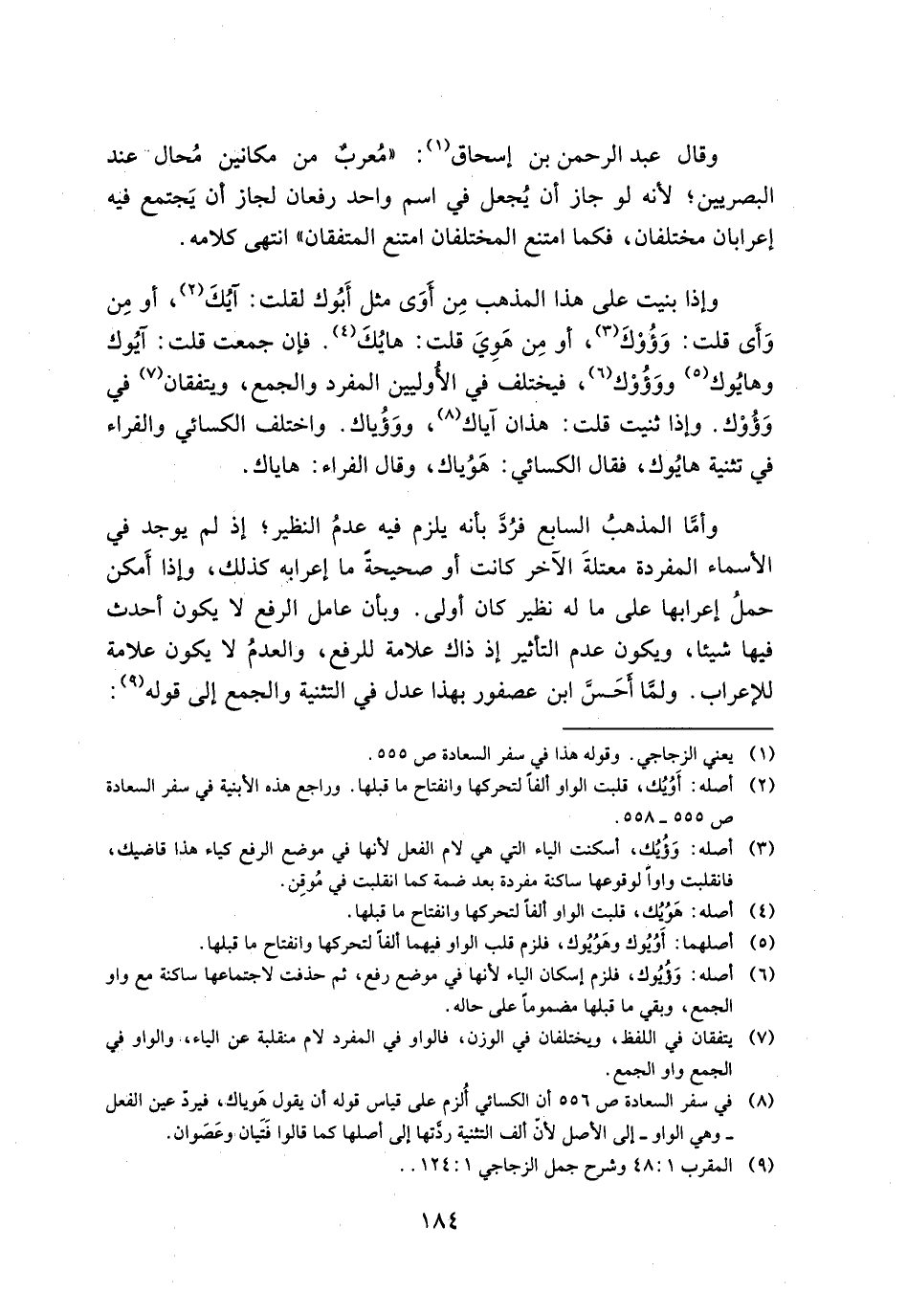 وإذا بنيت على هذا المذهب من أوى مثل أبوك لقلت: آياك، أو من وأى قلت: ووؤؤك، أو من هوى قلت: هايك. فإن جمعت قلت: ايوك وهيوك ووؤؤك، فيختلف في الأوليين المفرد والجمع، ويتفقان في وؤوك. وإذا ثنيت قلت: هذان آياك، ووؤياكز واختلف الكسائي والفراء في تثنية هايوك، فقال الكسائي: هوياك، وقال الفراء: هاياك.