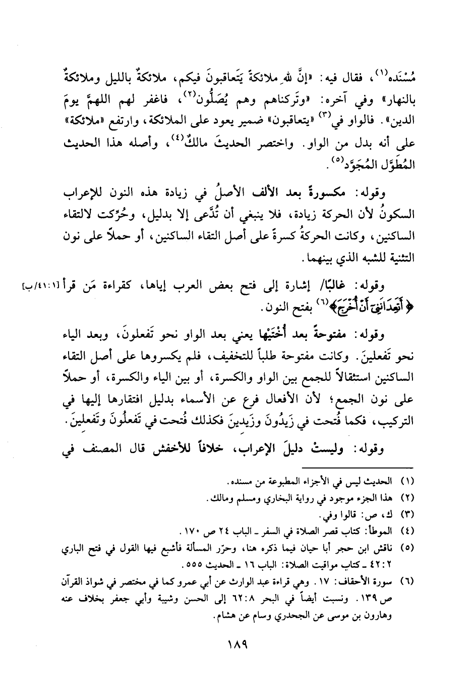 مسنده، فقال فيه: "إن لله ملائكة يتعاقبون فيكم، ملائكةً بالليل وملائكةً بالنهار" وفي آخره: "وتركناهم وهم يصلون" فاغفر لهم اللهم يوم الدين". فالواو في "يتعاقبون" ضمير يعود على الملائكة، وارتفع "ملائكةً" على أنه بدل من الواو. واختصر الحديث، مالك، وأصله هذا الحديث المطول المجود.