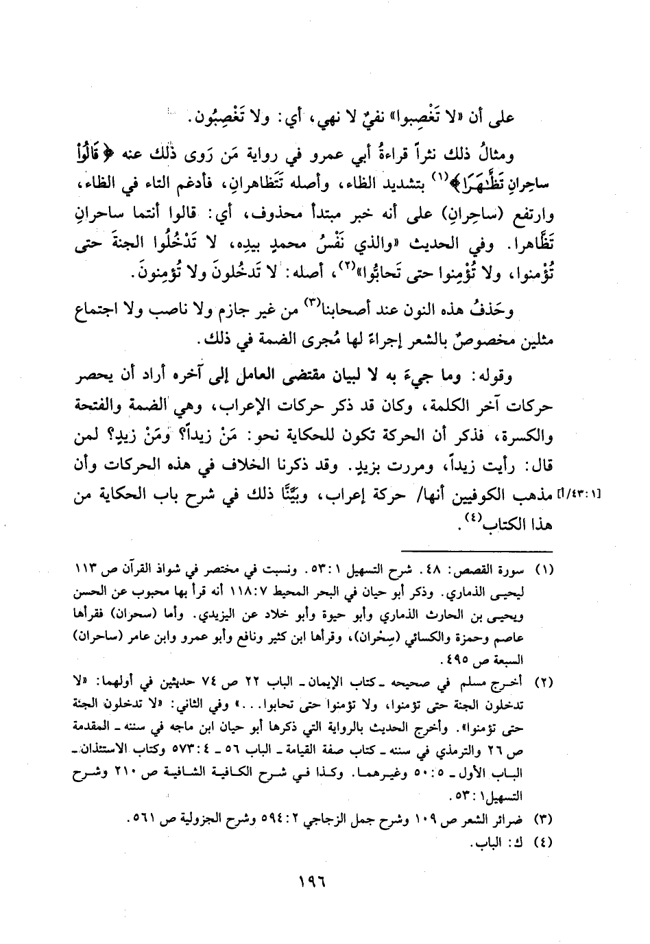 ومثال ذلك نثرًا قراءة أبي عمرو في رواية من روى ذلك عنه {قَالُوا سَاحِرَانِ تَظَّاهَرَا}، بتشديد الظاء، وأصله تتظاهران، فأدغم التاء في الظاء، وارتفع (ساحران) على أنه خبر مبتدأ محذوف، أي: قالوا أنتما ساحران تظاهرا. وفي الحديث "والذي نفس محمد بيده، لا تدخلوا الجنة حتى تؤمنوا، ولا تؤمنوا حتى تحابوا"، أصله: لا تدخلون ولا تؤمنون.