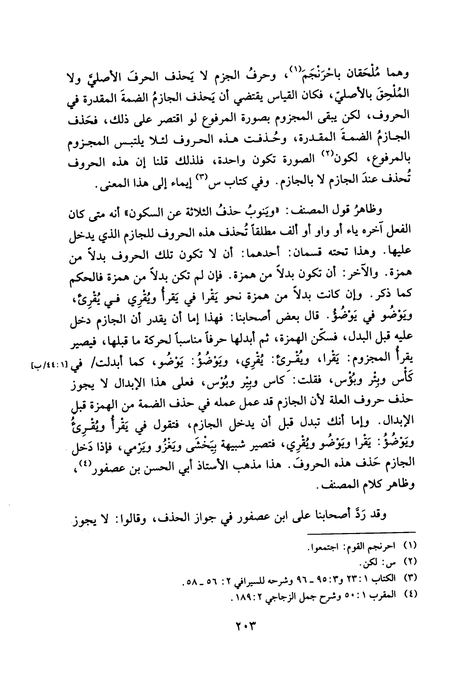 وهما ملحقان باحرنجم، وحرف الجزم لا يحذف الحرف الأصلي ولا الملحق بالأصلي، فكان القياس يقتضي أن يحذف الجازم الضمة المقدرةً في الحروف، لكن يبقى المجزوم بصورة المرفوع لو اقتصر على ذلك، فحذف الجازم الضمةً المقدرةً، وحذفت هذه الحروف لئلا يلتبس المجزوم بالمرفوع، لكون الصورة تكون واحدةً، فلذلك قلنا إن هذه الحروف تحذف عند الجازم لا بالجازم. وفي كتاب س إيماء إلى هذا المعنى.