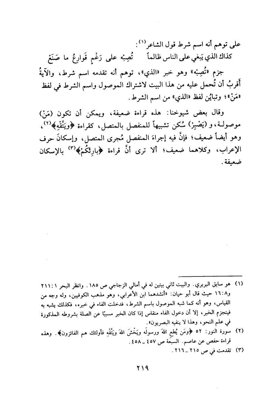 جزم "تصبه "وهو خبر "الذي "، توهم أنه تقدمه اسم شرط، والآية أقرب أن تحمل عليه من هذا البيت لاشتراك الموصول واسم الشرط في لفظ "من "؛ وتباين لفظ "الذي "من اسم الشرط.