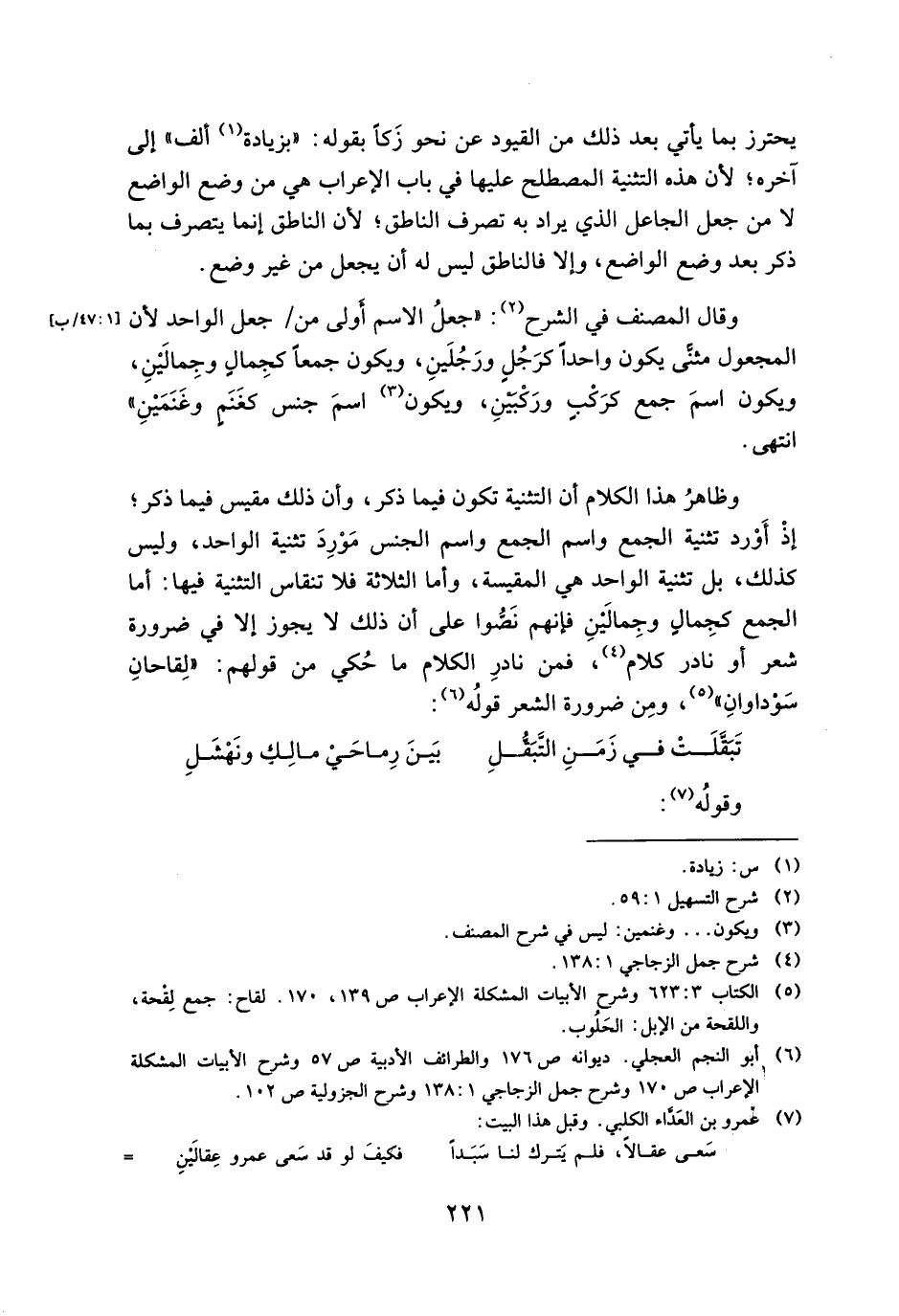 وظاهر هذا الكلام أن التثنية تكون فيما ذكر، وأن ذلك مقيس فيما ذكر؛ إذ أورد تثنية الجمع واسم الجمع واسم الجنس مورد تثنية الواحد، وليس كذلك، بل تثنية الواحد هي المقيسة، وأما الثلاثة فلا تنقاس التثنية فيها: أما الجمع كجمال وجمالين فإنهم نصوا على أن ذلك لا يجوز إلا في ضرورة شعر أو نادر كلام، فمن نادر الكلام ما حكي من قولهم: "لقاحان سوداوان"، ومن ضرورة الشعر قوله: