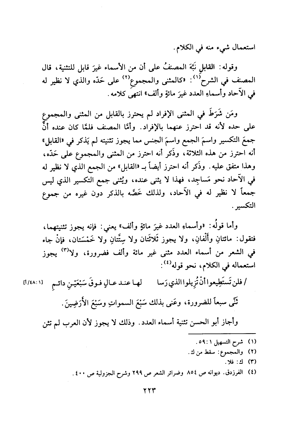 ومن شرط في المثنى الإفراد لم يحترز بالقابل من المثنى والمجموع على حده لأنه قد احترز عنهما بالإفراد. وأما المصنف فلما كان عنده أن جمع التكسير واسم الجمع واسم الجنس مما يجوز تثنيته لم يذكر في "القابل" أنه احترز من هذه الثلاثة، وذكر أنه احترز من المثنى والمجموع على حده، وهذا متفق عليه. وذكر أنه احترز أيضًا بـ "القابل" من الجمع الذي لا نظير له في الآحاد نحو مساجد، فهذا لا يثنى عنده، ويثنى جمع التكسير الذي ليس جمعًا لا نظير له في الآحاد، ولذلك خصه بالذكر دون غيره من جموع التكسير.
