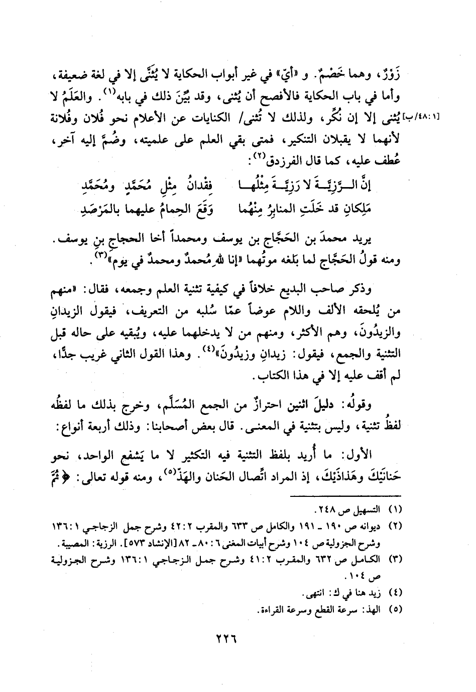 زور، وهما خصم. و"أي" في غير أبواب الحكاية لا يثنى إلا في لغة ضعيفة، وأما في باب الحكاية فالأفصح أن يثنى، وقد بين ذلك في بابه. والعلم لا يثنى إلا إن نكر، ولذلك لا تثنى /الكنايات عن الأعلام نحو فلان وفلانة لأنهما لا يقبلان التنكير، فمتى بقي العلم على علميته، وضم إليه آخر، عطف عليه، كما قال الفرزدق: