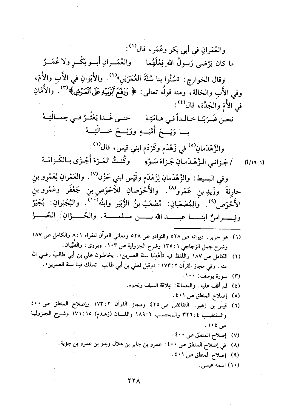 وفي البسيط: والزهدمان لزهدم وقيس ابني حزن. والعمران لعمرو بن حارثة وزيد بن عمرو. والأحوصان للأحوص بن جعفر وعمرو بن الأحوص. والمصعبان: مصعب بن الزبير وابنه. والبجيران: بجير وفراس ابنا عبد الله بن مسلمة. والحران: الحر