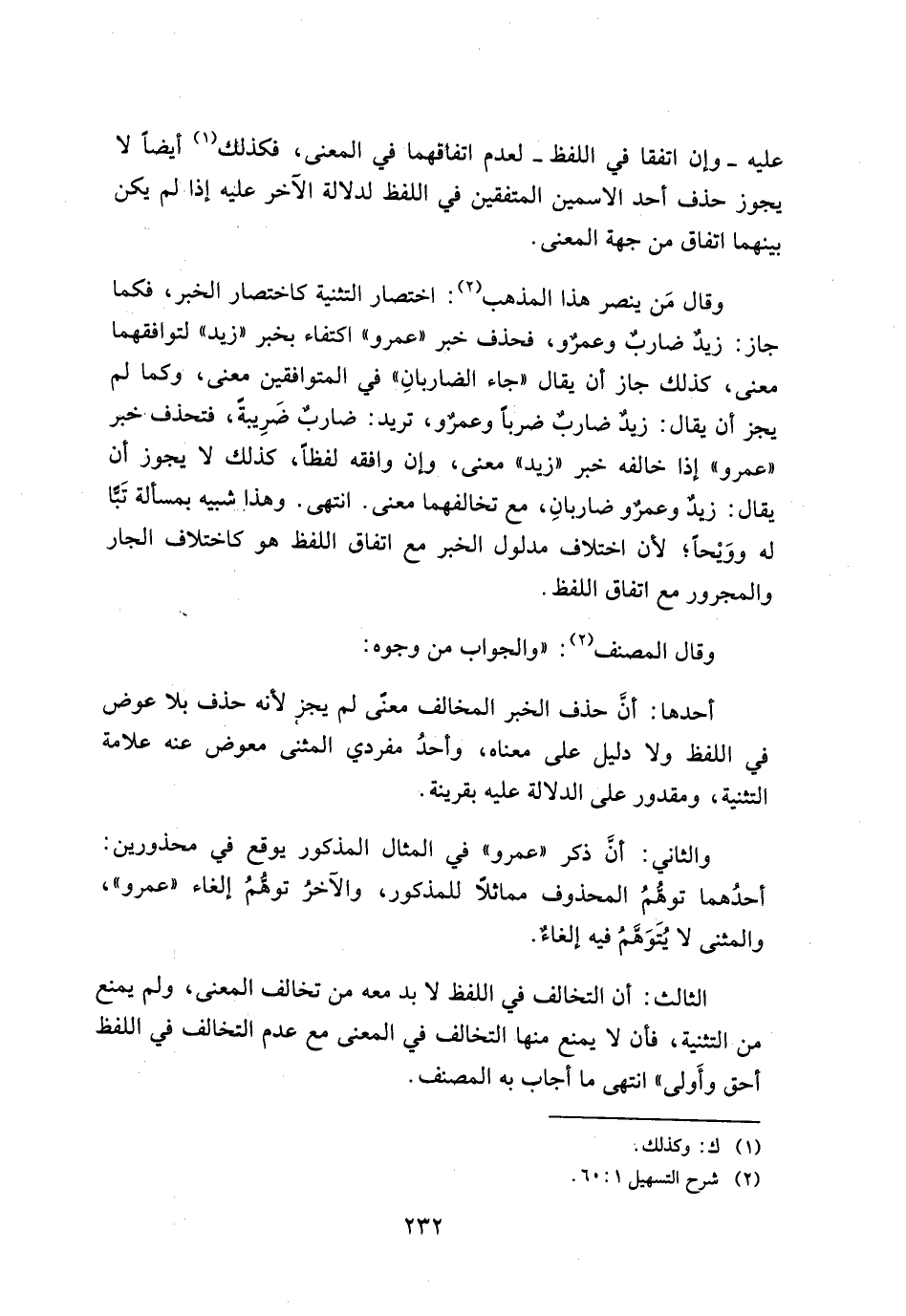 والثاني: أن ذكر ((عمرو)) في المثال المذكور يوقع في محذورين: أحدهما توهم المحذوف مماثلا للمذكور، والآخر توهم إلغاء ((عمرو))، والمثني لا يتوهم فيه إلغاء.
