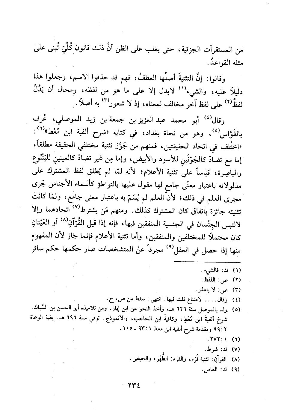وقال أبو محمد عبد العزيز بن جمعة بن زيد الموصلي، عرف بالقواس، وهو من نحاة بغداد، في كتابه ((شرح ألفية ابن معط)): ((اختلف في اتحاد الحقيقتين، فمنهم من جوز تثنية مختلفي الحقيقة مطلقا، إما مع تضاد كالجونين للأسود والأبيض، وإما من غير تضاد كالعينين للينبوع والباصرة، قياسا علي تثنية الأعلام؛ لأنه لما لم يطلق لفظ المشترك علي مدلولاته باعتبار معني جامع لما مقول عليها بالتواطؤ كأسماء الأجناس جري مجري العلم في ذلك؛ لأن العلم لم يسم به باعتبار معني جامع، ولما كانت تثنمية جائزة باتفاق كان المشترك كذلك. ومنهم من يشترط اتحادهما وإلا لالتبس الجنسان في الجنسية المتفقين فيها، فإنه إذا قيل القرآن أو العينان كان محتملا للمختلفين والمتفقين، وأما تثنية الأعلام فإنما جاز لأن المفهوم منها إذا حصل في العقل مجردا عن المتشخصات صار حكمها حكم سائر