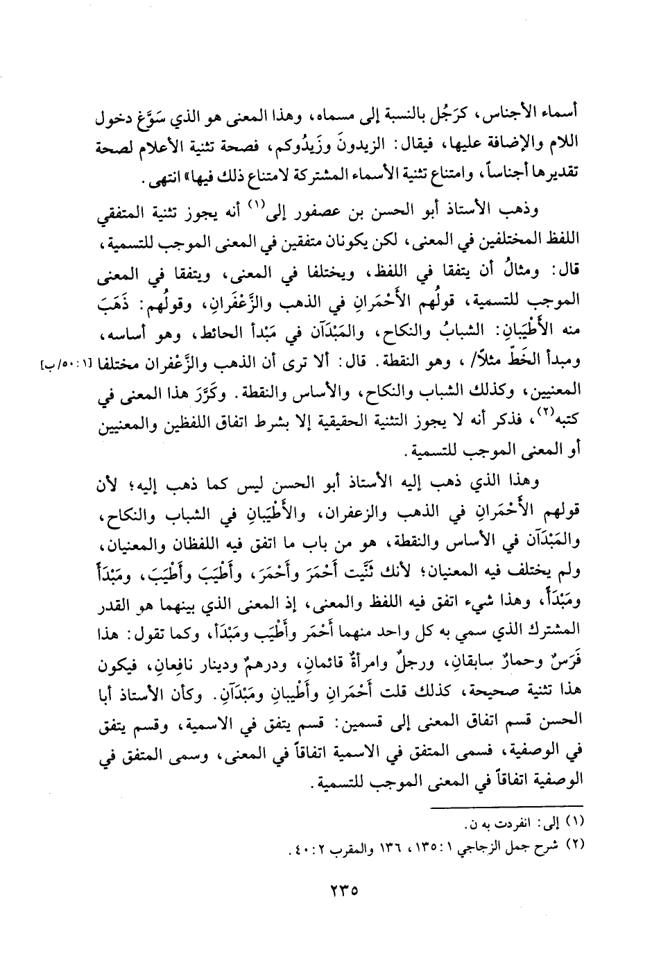 وذهب الأستاذ أو الحسن بن عصفور إلي أنه يجوز تثنية المتفقي اللفظ المختلفين في المعني، لكن يكونان متفقين في المعني الموجب للتسمية، قال: ومثال أن يتفقا في اللفظ، ويختلفا في المعني، ويتفقا في المعني الموجب للتسمية، قولهم الأحمران في الذهب والزعفران، وقولهم: ذهب منه الأطيبان: الشباب والنكاح، والمبدآن في مبدأ الحائط، وهو أساسه، ومبدأ الخط مثلا/، وهو النقطة. قال: ألا تري أن الذهب والزعفران مختلفا المعنيين، وكذلك الشباب والنكاح، والأساس والنقطة. وكرر هذا المعني في كتبه، فذكر أنه لا يجوز التثنية الحقيقية إلا بشرط اتفاق اللفظين والمعنيين أو المعني الموجب للتسمية.