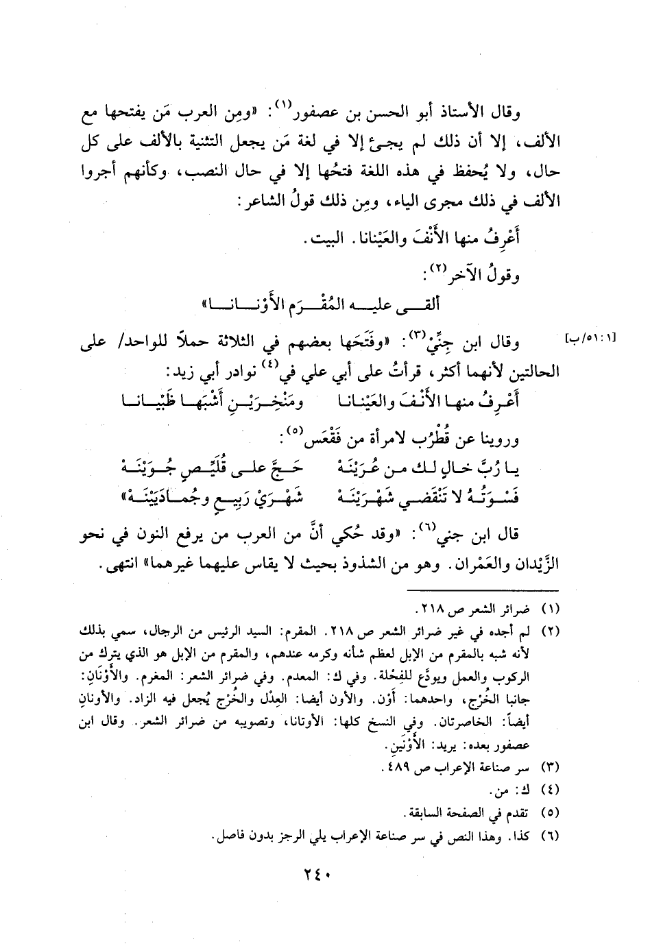 وقال الأستاذ أبو الحسن بن عصفور: ((ومن العرب من يفتحها مع الألف، إلا أن ذلك لم يجئ إلا في لغة من يجعل التثنية بالألف علي كل حال، ولا يحفظ في هذه اللغة فتحها إلا في حال النصب، وكأنهم أجروا الألف في ذلك مجري الياء، ومن ذلك قول الشاعر: