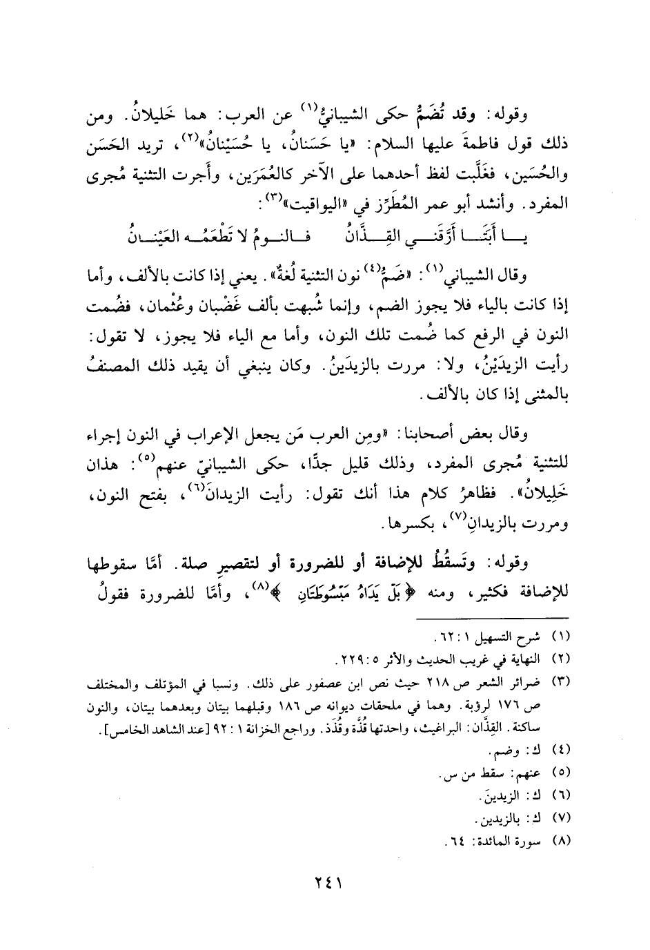 وقوله: وقد تضم حكي الشيباني عن العرب: هما خليلان. ومن ذلك قول فاطمة عليها السلام: ((يا حسنان، يا حسينان))، تريد الحسن والحسين، فغلبت لفظ أحدهما علي الآخر كالعمرين، وأجرت التثنية مجري المفرد. وأنشد أبو عمر المطرز في ((اليواقيت)):