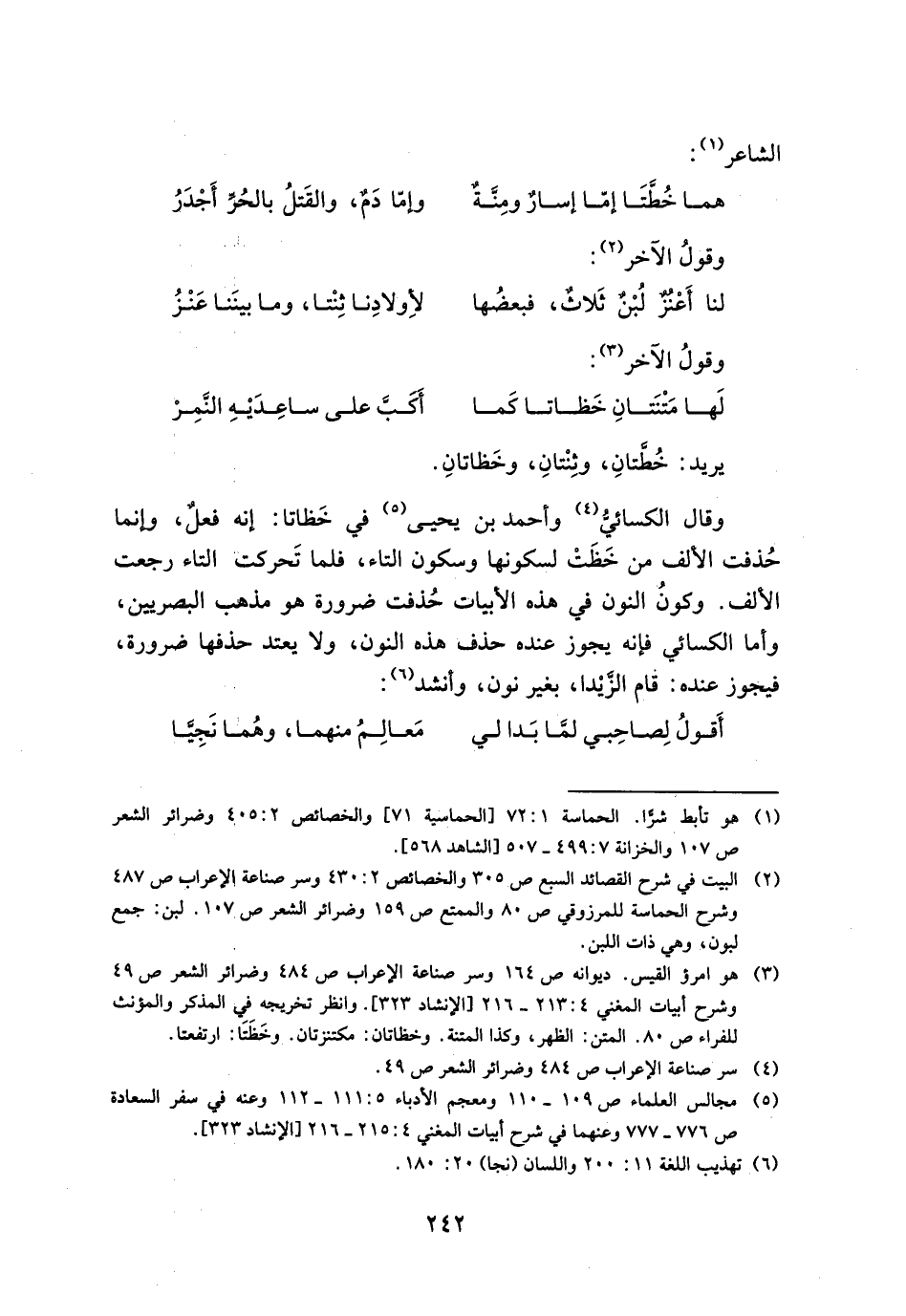 وقال الكسائي وأحمد بن يحي في خظاتا: إنه فعل، وإنما حذفت الألف من خظت لسكونها وسكون التاء، فلما تحركت التاء رجعت الألف. وكون النون في هذه الأبيات حذفت ضرورة هو مذهب البصريين، وأما الكسائي فإنه يجوز عنده حذف هذه النون، ولا يعتد حذفها ضرورة، فيجوز عنده: قام الزيدا، بغير نون، وأنشد: