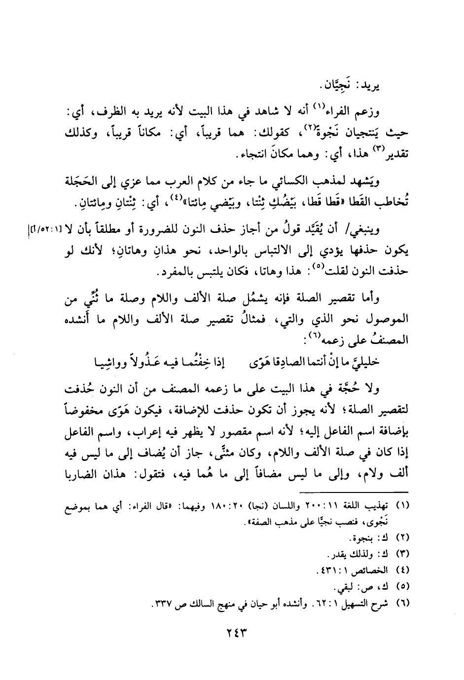 وزعم الفراء أنه لا شاهد في هذا البيت لأنه يريد به الظرف، أي: حيث ينتجيان نجوة، كقولك: هما قريبا، أي: مكانا قريبا، وكذلك تقدير هذا، أي: وهما مكان انتجاء.