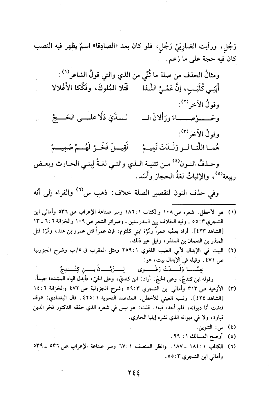 ومثال الحذف من صلة ما ثني من الذي والتي قول الشاعر: