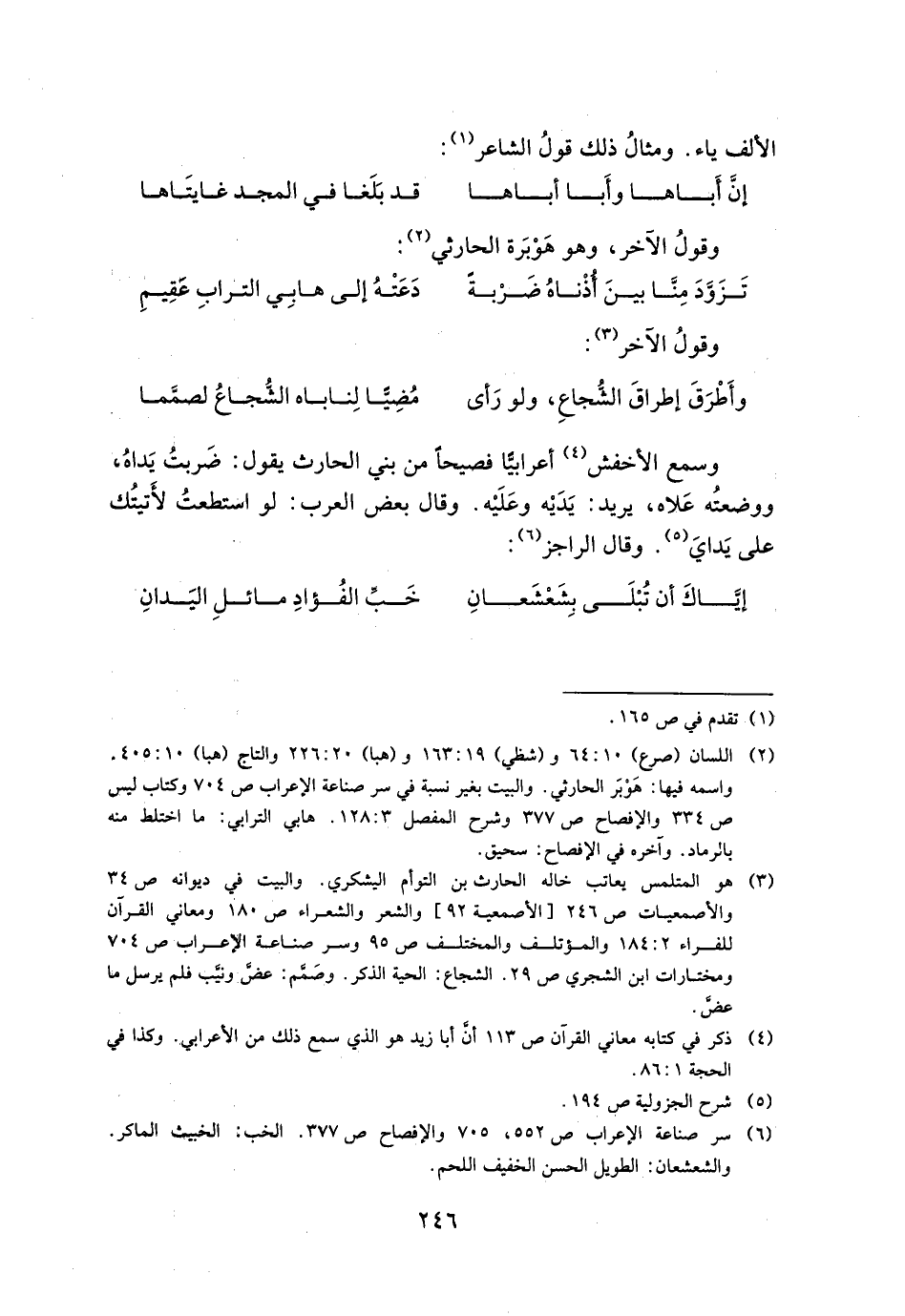 وسمع الأخفش أعرابيا فصيحا من بني الحارث يقول: ضربت يداه، ووضعته علاه، يريد: يديه وعليه. وقال بعض العرب: لو استطعت لأتيتك علي يداي. وقال الراجز: