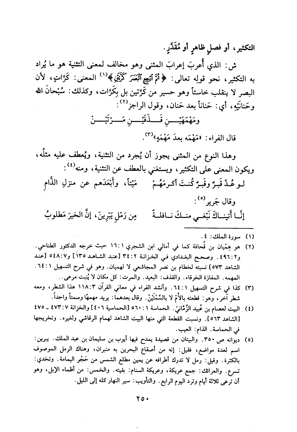 ش: الذي أعرب إعراب المثني وهو مخالف لمعني التثنية هو ما يراد به التكثير، نحو قوله تعالي: {ثُمَّ ارْجِعِ الْبَصَرَ كَرَّتَيْنِ} المعني: كرات، لأن البصر لا ينقلب خاسئا وهو حسير من كرتين بل بكرات، وكذلك: سبحان الله وحنانيه، أي: حنانا بعد حنان، وقول الراجز: