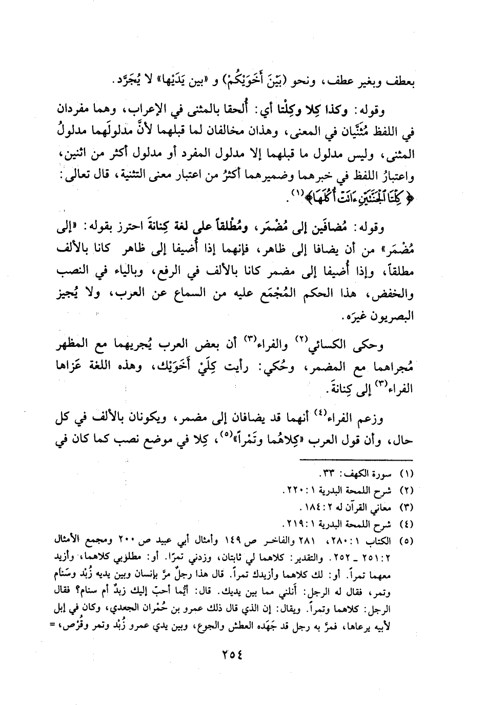 وزعم الفراء أنهما قد يضافان إلى مضمر، ويكونان بالألف في كل حال، وأن قول العرب "كلاهما وتمرًا"، كلا في موضع نصب كما كان في