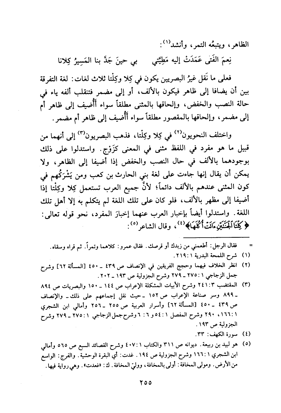 واختلف النحويون في كلا وكلتا، فذهب البصريون إلى أنهما من قبيل ما هو مفرد في اللفظ مثنى في المعنى كزوج. واستدلوا على ذلك بوجودهما بالألف في حالة النصب والخفض إذا أضيفا إلى الظاهر، ولا يمكن أن يقال إنها جاءت على لغة بني الحارث بن كعب ومن يشركهم في كون المثنى عندهم بالألف دائمًا؛ لأن جميع العرب تستعمل كلا وكلتا إذا أضيفا إلى مظهر بالألف، فلو كان على تلك اللغة لم يتكلم به إلا أهل تلك اللغة. واستدلوا أيضًا بإخبار العرب عنهما إخبار المفرد، نحو قوله تعالى: {كِلْتَا الجَنَّتَيْنِ آتَتْ أُكُلَهَا}، وقال الشاعر:
