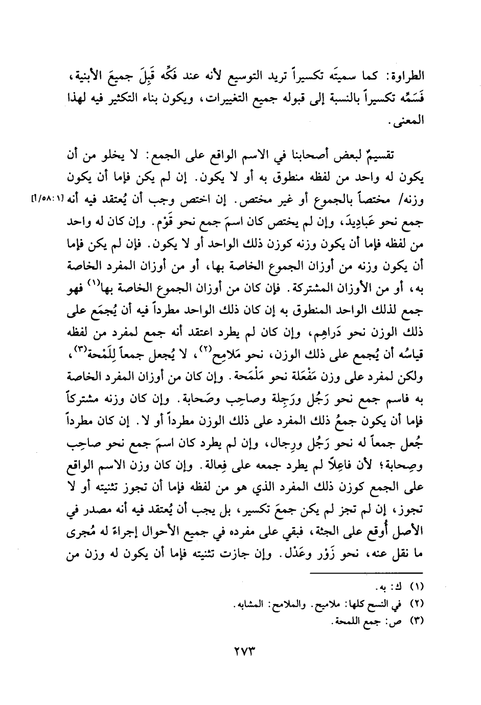 تقسيم لبعض أصحابنا في الاسم الواقع على الجمع: لا يخلو من أن يكون له واحد من لفظه منطوق به أو لا يكون. إن لم يكن فإما أن يكون وزنه/ مختصاً بالجموع أو غير مختص. إن اختص وجب أن يعتقد فيه أنه جمعه نحو عباديد وإن لم يختص كان اسم جمع نحو قوم. وإن كان له واحد من لفظه فإما أن يكون وزنه كوزن ذلك الواحد أو لا يكون، فإن لم يكن فإما أن يكون وزنه من أوزان الجموع الخاصة بها، أو من أوزان المفرد الخاصة به، أو من الأوزان المشتركة. فإن كان من أوزان الجموع الخاصة بها فهو جمع لذلك الواحد المنطوق به إن كان ذلك الواحد مطرداً فيه أن يجمع على ذلك الوزن نحو دراهم، وإن كان لم يطرد اعتقد أنه جمع لمفرد من لفظه قياسه أن يجمع على ذلك الوزن، نحو ملامح ولا يجعل جمعاً للمحة ولكن لمفرد على وزن مفعلة نحو ملمحة. وإن كان من أوزان المفرد الخاصة به فاسم جمع نحو رجل ورجلة وصاحب وصحابة. وإن كان وزنه مشتركاً فإما أن يكون جمع ذلك المفرد على ذلك الوزن مطرداً أو. إن كان مطرداً جعل جمعاً له نحو رجل ورجال، وإن لم يطرد كان اسم جمع نحو صاحب وصحابة، لأن فاعلاً لم يطرد جمعه على فعالة. وإن كان وزن الاسم الواقع على الجمع كوزن ذلك المفرد الذي هو من لفظه فإما أن تجوز تثنيته أو لا تجوز، إن لم تحز لم يكن جمع تكسير، بل يجب أن يعتقد فيه أنه مصدر في الأصل أوقع على الجثة فبقى على مفرده في جميع الأحوال إجراء له مجرى ما نقل عنه، نحو زور وعدل. وإن جازت تثنيته فإما أن يكون له وزن من