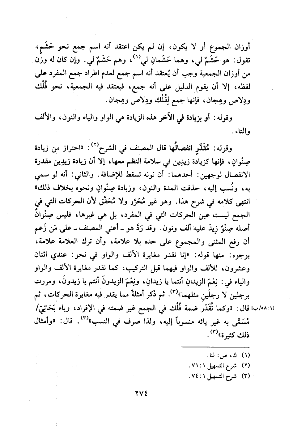 وقوله: مقدر انفصالها قال المصنف في الشرح: "احتراز من زيادة صنوان فإنها كزيادة في سلامة النظم معها إلا أن زيادة زيدين مقدرة الانفصال لوجهين: أحدهما: أنه نونه تسقط للإضافة. والثاني: أنه لو سمي به، ونسب إليه حذفت المدة والنون وزيادة صنوان ونحوه بخلاف ذلك" انتهى كلامه في شرح هذا. وهو غير محرر ولا محقق لأن الحركات التي في الجمع ليست عين الحركات التي في المفرد، بل هي غيرها، فليس صنوان أصله صنو زيد عليه ألف نون. وقد رد هو - أعني المصنف- على من زعم أن رفع المثنى والمجموع على حده بلا علامة، وأن ترك العلامة علامة، بوجوه: منها قوله: " إنا نقدر مغايرة الألف والواو في نحو: عندي اثنان وعشرون للألف والواو فيهما قبل التركيب، كما نقدر مغايرة الألف والواو والياء في: نعم الزيدان أنتما يا زيدان، ونعم الزيدون أنتم يا زيدون، ومررت برجلين لا رجلين مثلهما". ثم ذكر أمثلة مما يقدر فيه كمغايرة الحركات، ثم قال: " وكما نقدر ضمة فلك في الجمع غير ضمته في الإفراد وياء بخاتي/ مسمى به غير يائه منسوباً إليه، ولذا صرف في النسب". قال: " وأمثال ذلك كثيرة"
