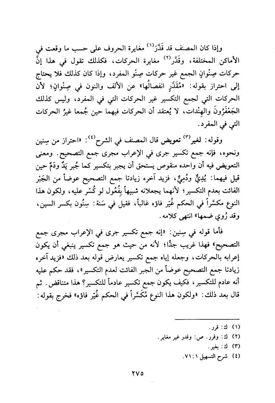 فأما قوله في سنين: " إنه جمع تكسير جرى في الإعراب مجرى جمع التصحيح" فهذا غريب جداً، لأنه من حيث هو جمع تكسير ينبغي أن يكون إعرابه بالحركات وجعله إياه جمع تكسير يعارض قوله بعد ذلك "فزيد آخره زيادتا جمع التصحيح عوضاً من الجبر الفائت لعدم التكسير" فقد حكم عليه أنه عادم التكسير فكيف يكون جمع تكسير عادماً للتكسير؟ هذا متناقض. ثم قال بعد ذلك: " ولكون هذا النوع مكسراً في الحكم غير فاؤه" فخرج بقوله: