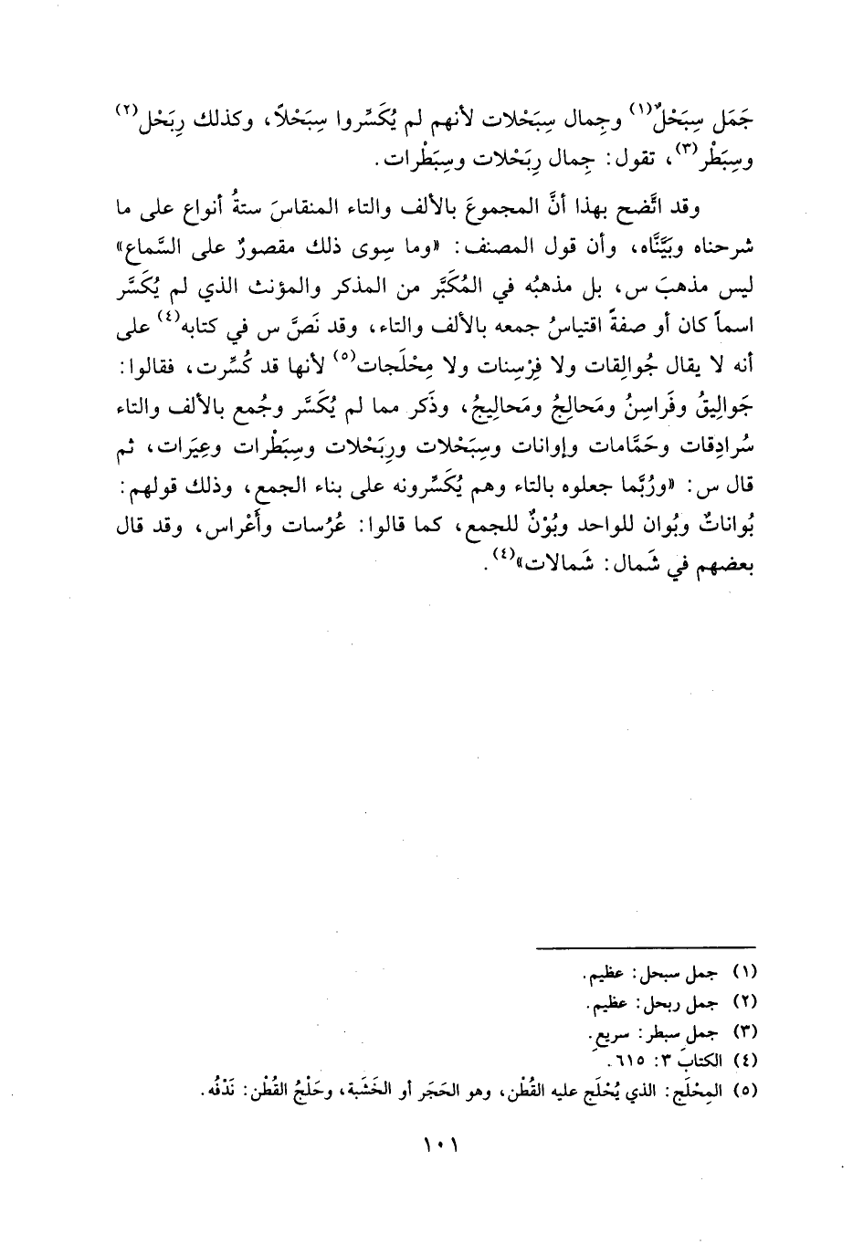 جمل سبحلٌ وجمال سبحلات لأنهم لم يُكسروا سجلًا، وكذلك ربحل وسبطر، تقول: جمال ربحلات وسبطرات.