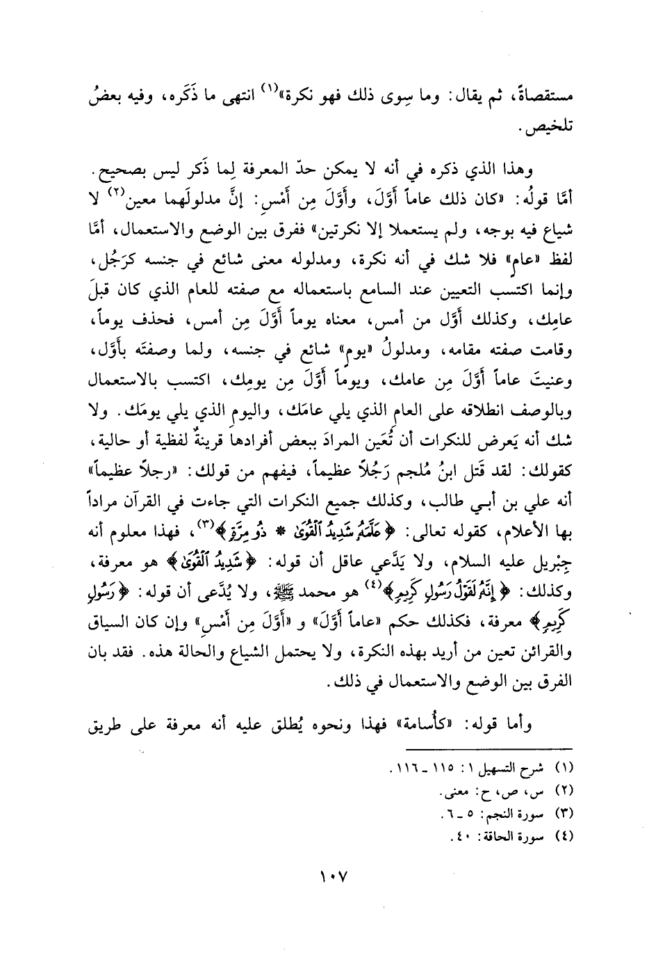 وهذا الذي ذكره في أنه لا يمكن حد المعرفة لما ذكر ليس بصحيح. أما قوله: "كان ذلك عامًا أول، وأول من أمس: إن مدلولهما معين لا شياع فيه بوجه، ولم يستعملا إلا نكرتين" ففرق بين الوضع والاستعمال، أما لفظ "عامٍ" فلا شك في أنه نكرة، ومدلوله معنى شائع في جنسه كرجل، وإنما اكتسب التعيين عند السامع باستعماله مع صفته للعام الذي كان قبل عامك، وكذلك أول من أمس، معناه يومًا أول من أمس، فحذف يومًا، وقامت صفته مقامه، ومدلول "يوم" شائع في جنسه، ولما وصفته بأول، وعنيت عامًا أول من عامك، ويومًا أول من يومك، اكتسب بالاستعمال وبالوصف انطلاقه على العام الذي يلي عامك، واليوم الذي يلي يومك. ولا شك أنه يعرض للنكرات أن تعين المراد ببعض أفرادها فرينةٌ لفظية أو حالية، كقولك: لقد قتل ابن مُلجم رجلًا عظيمًا، فيفهم من قولك: "رجلًا عظيمًا" أنه على بن أبي طالب، وكذلك جميع النكرات التي جاءت في القرآن مرادًا بها الأعلام، كقوله تعالى: {عَلَّمَهُ شَدِيدُ الْقُوَى * ذُو مِرَّةٍ}، فهذا معلوم أنه جبريك عليه السلام، ولا يدعي عاقل أن قوله: {شَدِيدُ الْقُوَى} هو معرفة وكذلك: {إِنَّهُ لَقَوْلُ رَسُولٍ كَرِيمٍ} هو محمد صلى الله عليه وسلم، ولا يُدعى أن قوله: {رَسُولٍ كَرِيمٍ} معرفة، فكذلك حكم "عامًا أول" و "أول من أمس" وإن كان السياق والقرائن تعين من أريد بهذه النكرة، ولا يحتمل الشياع والحالة هذه. فقد بان الفرق بين الوضع والاستعمال في ذلك.
