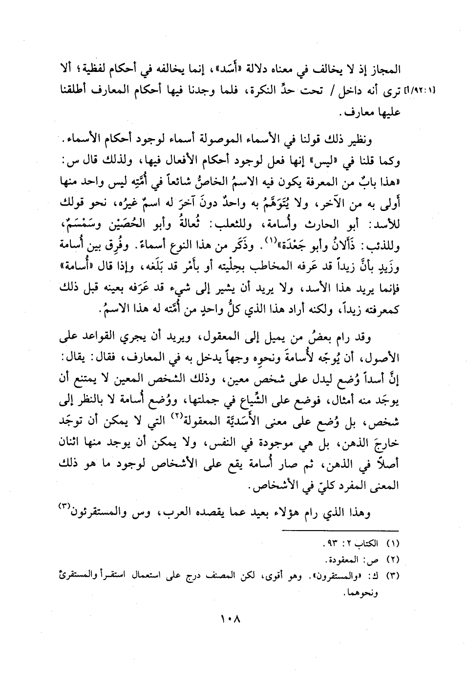 ونظير ذلك قولنا في الأسماء الموصولة أسماء لوجود أحكام الأفعال فيها، ولذلك قال س: "هذا بابٌ من المعرفة يكون فيه الاسم الخاص شائعًا في أمته ليس واحد منها أولى به من الآخر، ولا يُتوهم به واحدٌ دون آخر له اسمٌ غيره، نحو قولك للأسد: أبو الحارث وأسامة، وللثعلب: ثعالة وأبو الحصين وسمسمٌ، وللذئب: ذألان وأبو جعدة". وذكر من هذا النوع أسماءً. وفرق بين أسامة زيدٍ بأن زيدٍ قد عرفه المخاطب بحليته أو بأمر قد بلغه، وإذا قال "أسامة" فإنما يريد هذا الأسد، ولا يريد أن يشير إلى شيء قد عرفه بعينه قبل ذلك كمعرفته زيدًا، ولكنه أراد هذا الذي كل واحدٍ من أمته له هذا الاسم.