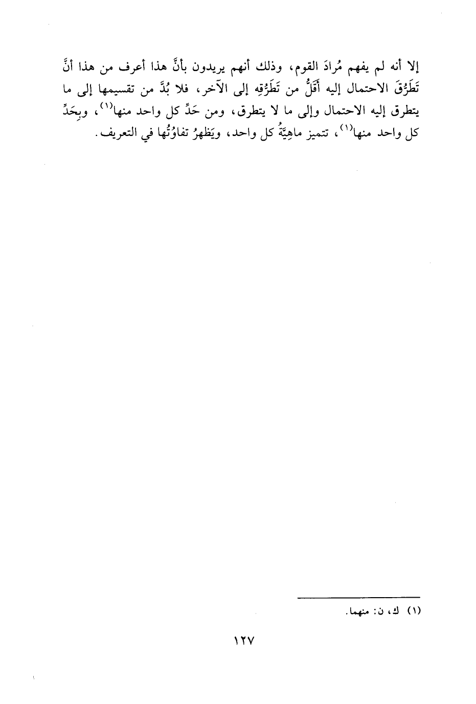 إلا أنه لم يفهم مراد القوم، وذلك أنهم يريدون بأن هذا أعرف من هذا أن تطرق الاحتمال إليه أو من تطرقه إلى الآخر، فلا بد من تقيمها إلى ما يتطرق إليه الاحتمال وإلى ما لا يتطرق، ومن حد كل واحد منها، ومن حد كل واحد منها، تتميز ماهيةً كل واحد، وتظهر تفاوتها في التعريف.