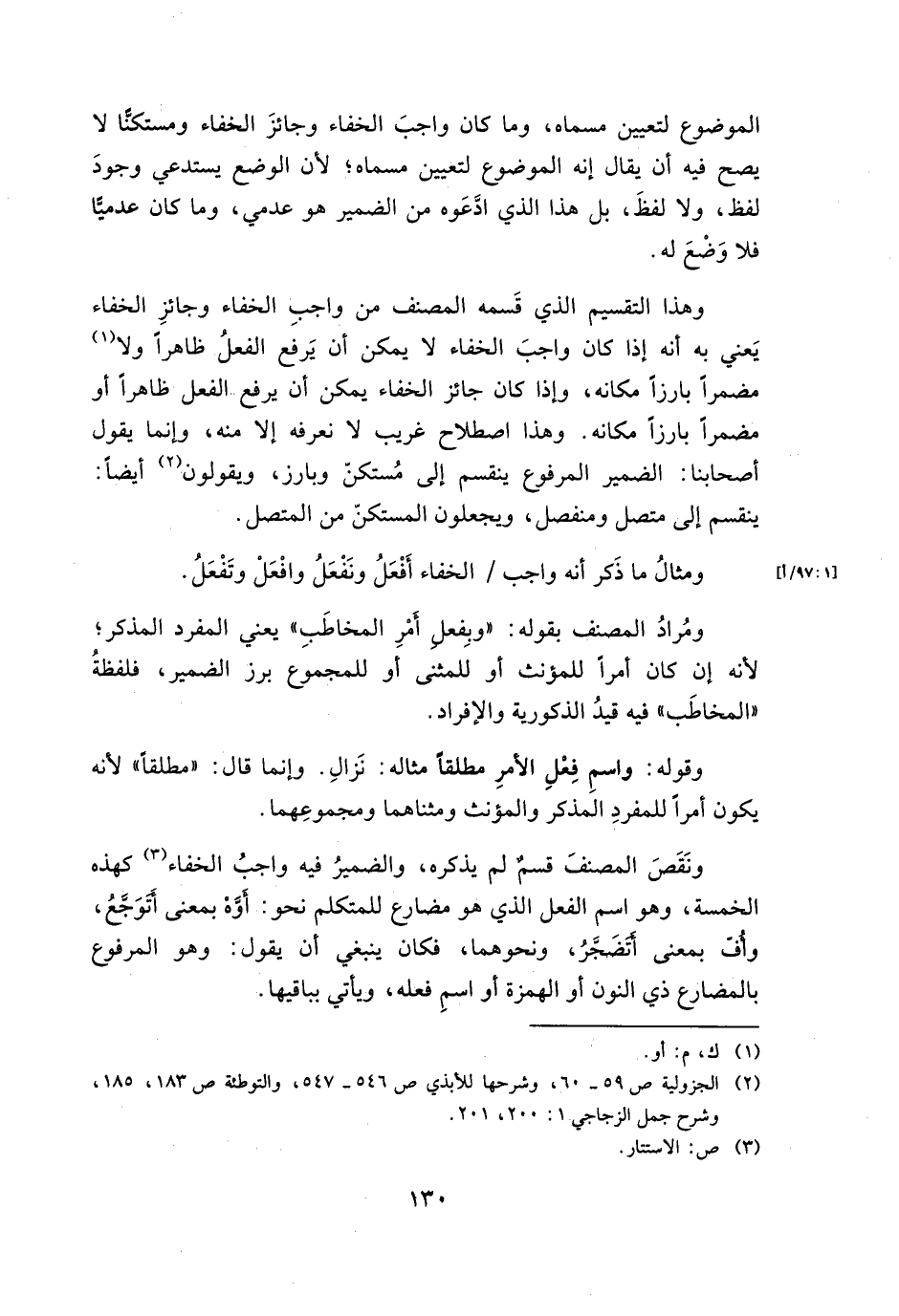 وهذا التقسيم الذي قسمه المصنف من واجب الخفاء وجائز الخفاء يعني به أنه إذا كان واجب الخفاء لا يمكن أن يرفع الفعل ظاهرًا ولا مضمرًا بارزًا مكانه، وإذا كان جائز الخفاء يمكن أن يرفع الفعل ظاهرًا أو مضمرًا بارزًا مكانه. وهذا اصطلاح غريب لا نعرفه إلا منه، وإنما يقول أصحابنا: الضمير المرفوع ينقسم إلى مستكن وبارز، ويقولون أيضًا ينقسم إلى متصل ومنفصل، ويجعلون المستكن من المتصل.