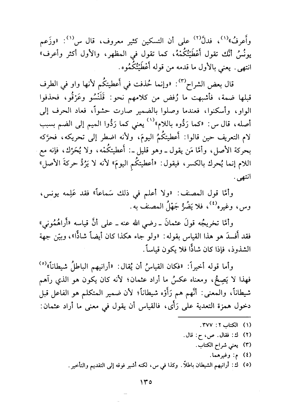 وأما قوله أخيرًا: "فكان القياس أن يقال: "أرانيهم الباطل شيطانًا" فهذا لا يصح، ومعناه عكس ما أراد عثمان؛ لأنه كان يكون هو الذي رآهم شيطانًا، والمعنى: أنهم هم رأوه شيطانًا؛ لأن ضمير المتكلم هو الفاعل قبل دخول همزةً التعدية على رأى، فالقياس أن يقول في معنى ما أراد عثمان: