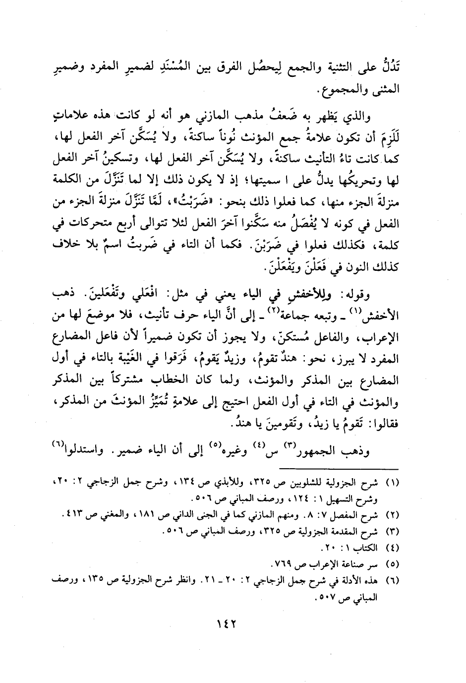 والذي يظهر به ضعف مذهب المازني هو أنه لو كانت هذه علامات للزم أن تكون علامة جمع المؤنث نوناً ساكنة، ولا يسكن آخر الفعل لها، كما كانت تاء التأنيث ساكنة، ولا يسكن آخر الفعل لها وتسكين آخر الفعل لها وتحريكها يدل على أسميتها، إذ لا يكون ذلك إلا لما تنزل من الكلمة منزلة الجزء منها، كما فعلوا ذلك بنحو: "ضربت" لما تنزل منزلة الجزء من الفعل في كونه لا يفصل منه سكنوا آخر الفعل لئلا تتوالى أربع متحركات في كلمة، فكذلك فعلوا في ضربن. فكما أن التاء في ضربت اسم بلا خلاف كذلك النون في فعلن ويفعلن.