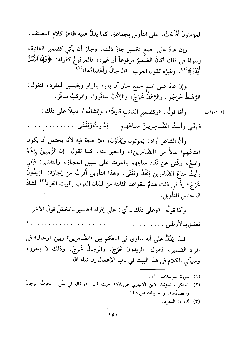 وأن الشاعر أراد: يموتون ويفنون فلا حجة فيه لأنه يحتمل أن يكون " متاعهم" بدلا من" الضامرين" والخبر عنه، كما تقول: إن الزيدين برهم واسع، وكنى عن نفاد متاعهم بالموت على سبيل المجاز، والتقدير: فإني رأيت متاع الضامرين ينفد ويفنى. وهذا التأويل أقرب من إجازة: الزيدون خرج، إذ في ذلك هدم للقواعد الثابتة من لسان العرب بالبيت الفرد الشاذ المحتمل للتأويل.