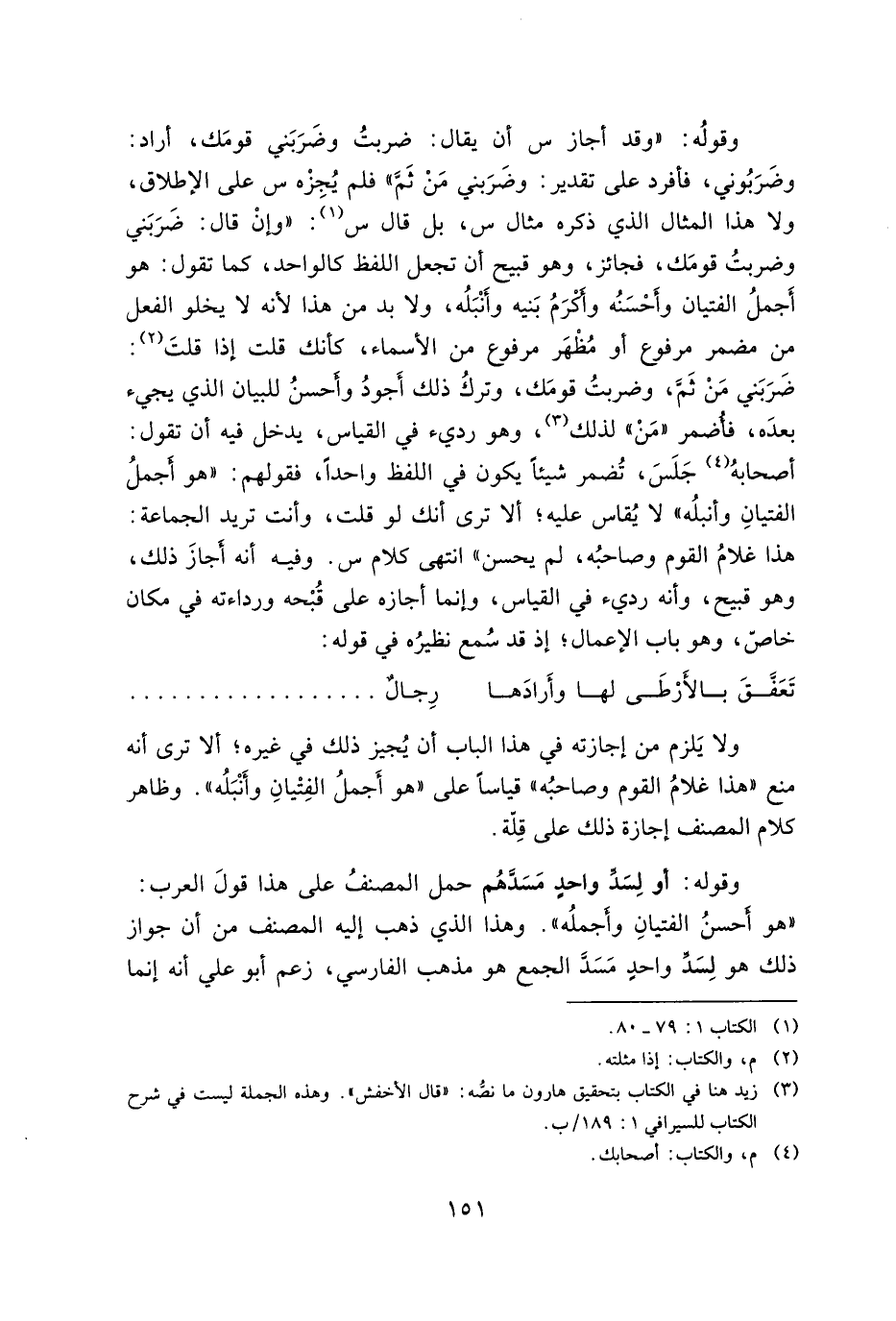 وقوله: " وقد أجاز س أن يقال: ضربت وضربني قومك، أراد: وضربوني، فأفرد على تقدير: وضربني من ثم" فلم يجزه س على الإطلاق، ولا هذا المثال الذي ذكره س بل قال س: " وأن قال: ضربني وضربت قومك فجائز، وهو قبيح أن تجعل اللفظ كالواحد كما تقول: هو أجمل الفتيان وأحسنه وأكرم بنيه وأنبله، ولا بد من هذا لأنه لا يخلو الفعل من مضمر مرفوع أو مظهر مرفوع من الأسماء، كأنك قلت إذا قلت: ضربني من ثم، وضربت قومك وترك ذلك أجود وأحسن للبيان الذي يجيء بعده فأضمر " من" لذلك، وهو رديء في القياس، يدخل فيه أن تقول: أصحابه جلس، تضمر شيئا يكون في اللفظ واحداً فقولهم: " هو أجمل الفتيان وأنبله" لا يقاس عليه، ألا ترى أنك لو قلت، وأنت تريد الجماعة: هذا غلام القول وصاحبه لم يحسن" انتهى كلام س. وفيه أنه أجاز لك، وهو قبيح وأنه رديء في القياس، وإنما أجازه على قبحه ورداءته في مكان خاص، وهو باب الإعمال إذا قد سمع نظيره في قوله: