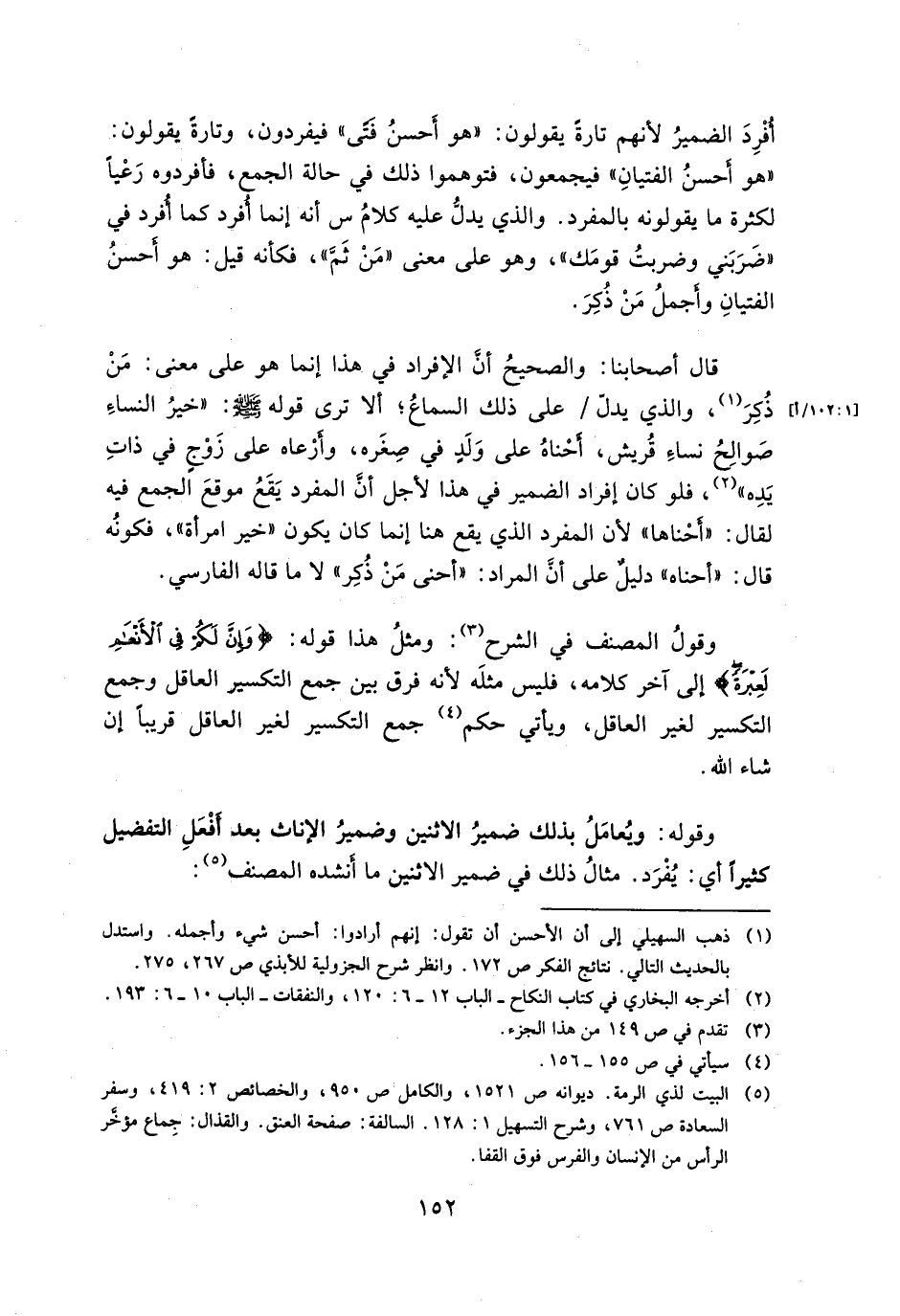 قال أصحابنا/: والصحيح أن الإفراد في هذا إنما هو على معنى: من ذكر والذي يدل/ على ذلك السماع، ألا ترى قوله صلى الله عليه وسلم: " خير النساء صوالح نساء قريش، أحناه على ولد في صغره وأرعاه على زوج في ذات يده، فلو كان إفراد الضمير في هذا لأجل أن المفرد يقع موقع الجمع فيه لقال: " أحناها" لأن المفرد الذي يقع هنا إنما كان يكون " خير امرأة " فكونه قال: " أحناه" دليل على أن المراد: " أحنى من ذكر" لا ما قاله الفارسي.