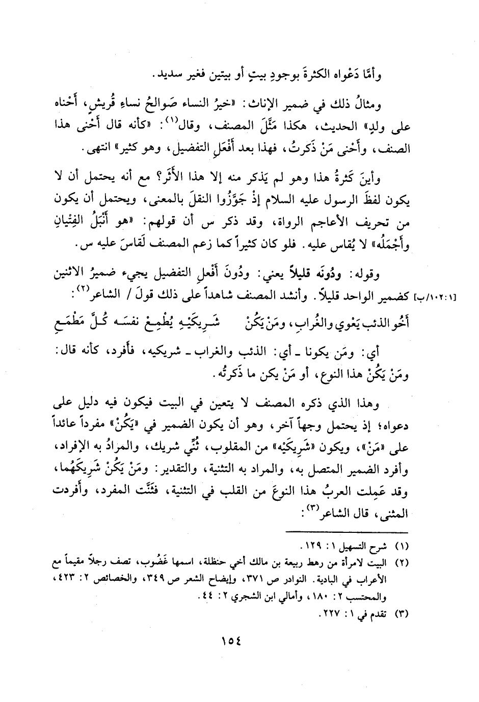 وهذا الذي ذكره المصنف لا يتعين في البيت فيكون فيه دليل على دعواه، إذ يحتمل وجهاً آخر، وهو أن يكون الضمير في "يكن" مفرداً عائداً على " من" ويكون "شريكيه" من المقلوب ثني شريك، والمراد به الإفراد، وأفراد الضمير المتصل به، والمراد به التثنية والتقدير: ومن يكن شريكهما، وقد عملت العرب هذا النوع من القلب في التثنية، فثبت المفرد، وأفردت المثنى قال الشاعر: