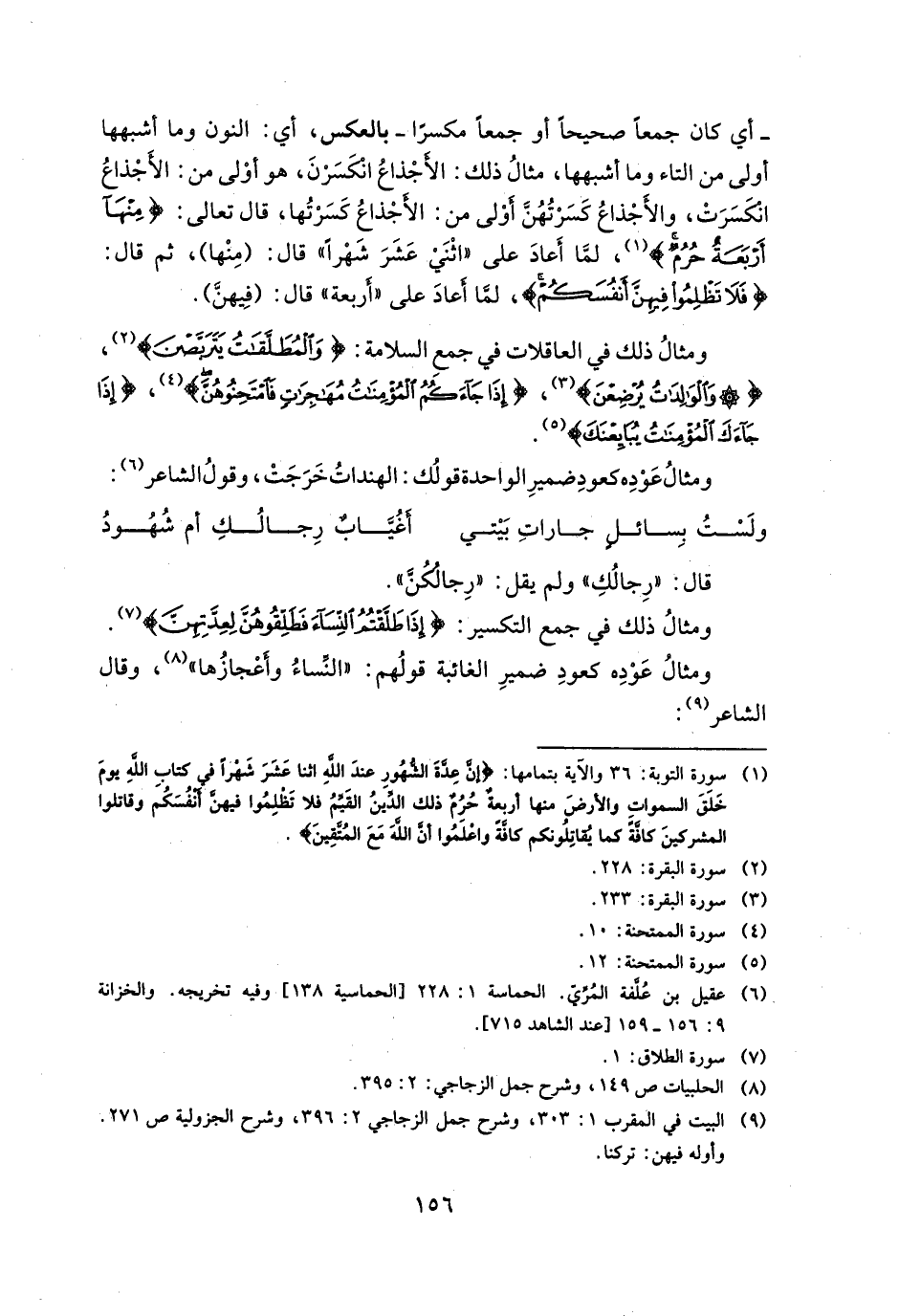 ومثال ذلك في جمع التكسير: {إِذَا طَلَّقْتُمُ النِّسَاءَ فَطَلِّقُوهُنَّ لِعِدَّتِهِنَّ} ومثال عوده كعود ضمير الغائبة قولهم: " النساء وأعجازها"، وقال الشاعر: