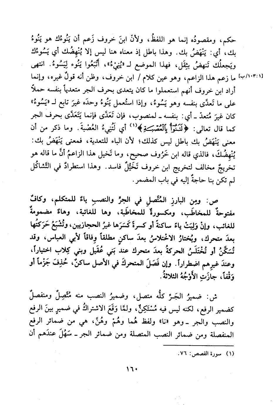 حكم، ومقصوده إنما هو اللفظ، ولأن ابن خروف زعم أن ينوؤك هو ينوء بل، أي: ينهض بك. وهذا باطل إذ معناه هنا ليس إلا ينهضك أي يسوءك ويجعلك تنهض بثقل، فهذا الموضع ل"ينئ" أتبعوا ينوء ليسوء. انتهى ما زعم هذا الزاعم وهو عين كلام/ ابن خروف، وظن أنه قول غيره، وإنما أراد ابن خروف أنهم استعملوا ما كان يتعدى بحرف الجر متعدياً بنفسه حملاً على ما تعدى بنفسه وهو يسوء وإذا استعمل ينوء وحده غير تابع ل" يسوء" كان غير متعد- أي: بنفسه- لمنصوب، فإن تعدى فإنما يتعدى بحرف الجر كما قال تعالى: {لَتَنُوءُ بِالْعُصْبَةِ} أي لتنئ العصبة. وما ذكر من أن معنى ينهض بك باطل ليس كذلك لأن الباء للتعدية فمعنى ينهض بك: ينهضك، فالذي قاله ابن خروف صحيح، وما تخيل هذا الزاعم أن ما قاله هو تخريج مخالف لتخريج ابن خروف تخيل فاسد. وهذا استطراد في التشاكل لم تكن بنا حاجة إليه في باب المضمر.