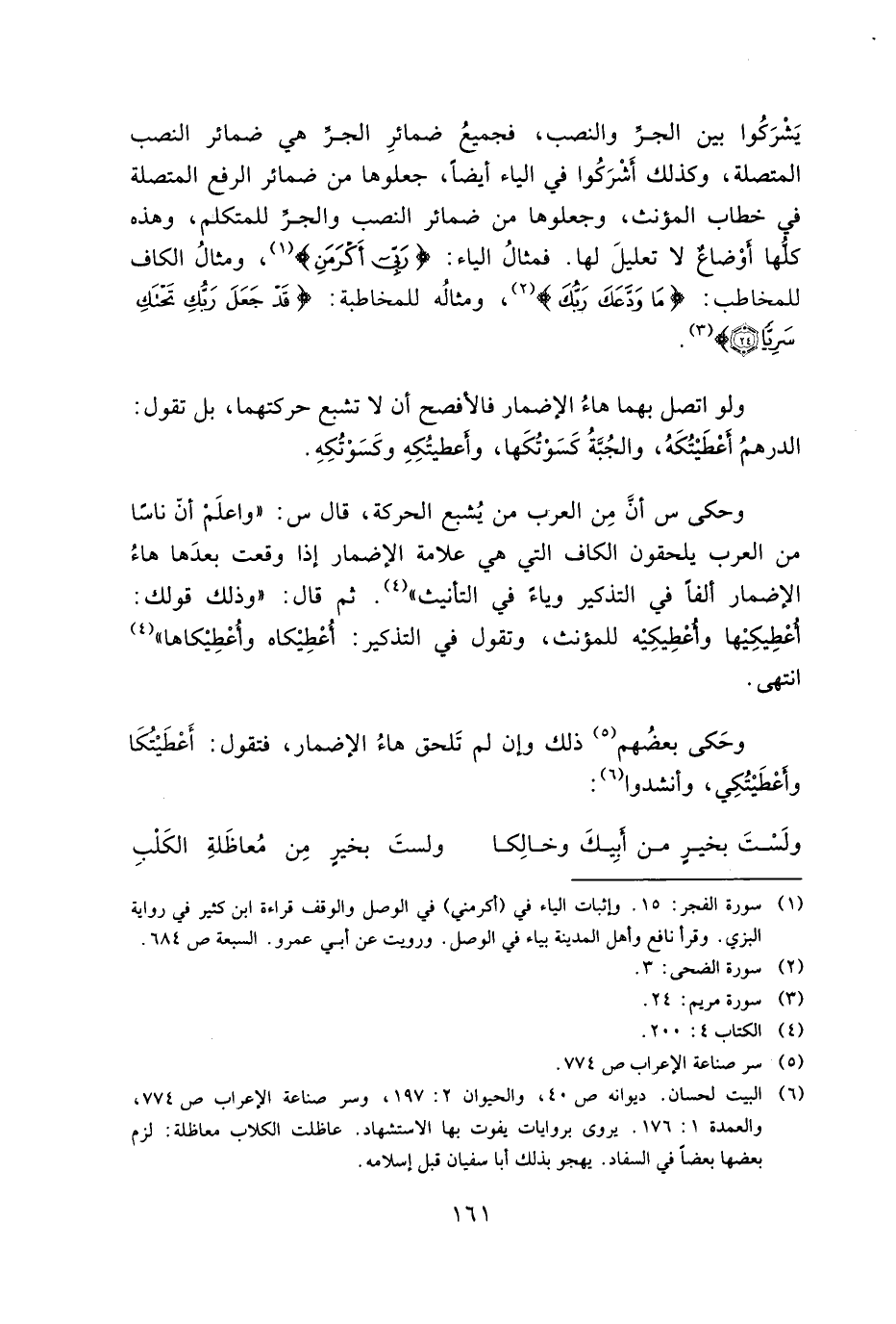 يشركوا بين الجر والنصب، فجميع ضمائر الجر هي ضمائر النصب المتصلة، وكذلك أشركوا في الياء أيضاً جعلوها من ضمائر الرفع المتصلة في خطاب المؤنث، وجعلوها من ضمائر النصب والجر للمتكلم، وهذه كلها أوضاع لا تعليل لها. فمثال الياء: {رَبِّي أَكْرَمَنِ} ومثال الكاف للمخاطب: {مَا وَدَّعَكَ رَبُّكَ}، ومثاله للمخاطبة: {قَدْ جَعَلَ رَبُّكِ تَحْتَكِ سَرِيّاً}.