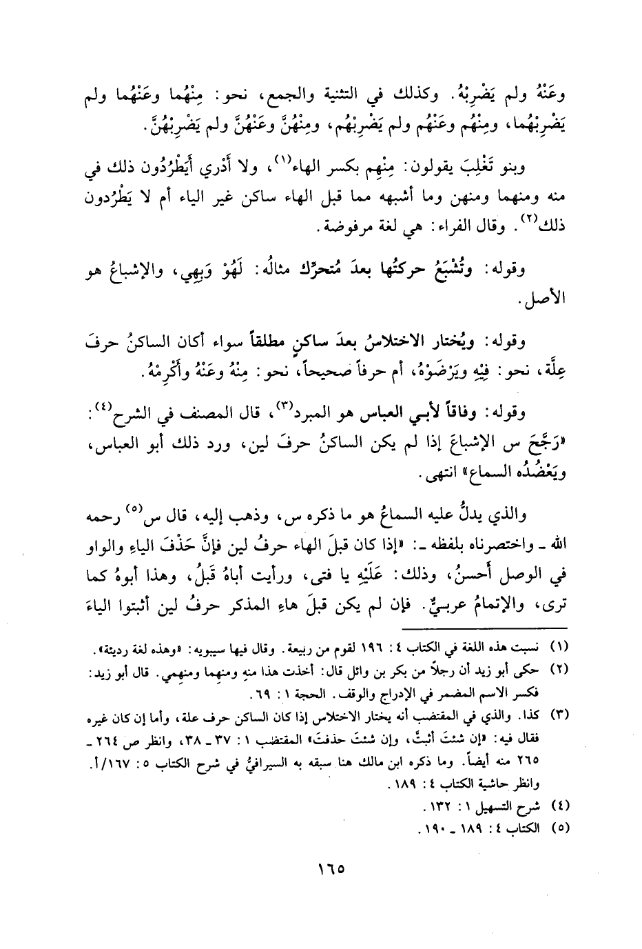 والذي يدل عليه السماع هو ما ذكره س وذهب إليه، قال س رحمه الله- واختصرناه بلفظه-: " إذا كان قبل الهاء حرف لين فإن حذف الياء والواو في الوصل أحسن وذلك: عليه يا فتى ورأيت أباه قبل، وهذا أبوه كما ترى، والإتمام عربي. فإن لم يكن قبل هاء المذكر حرف لين أثبتوا الياء