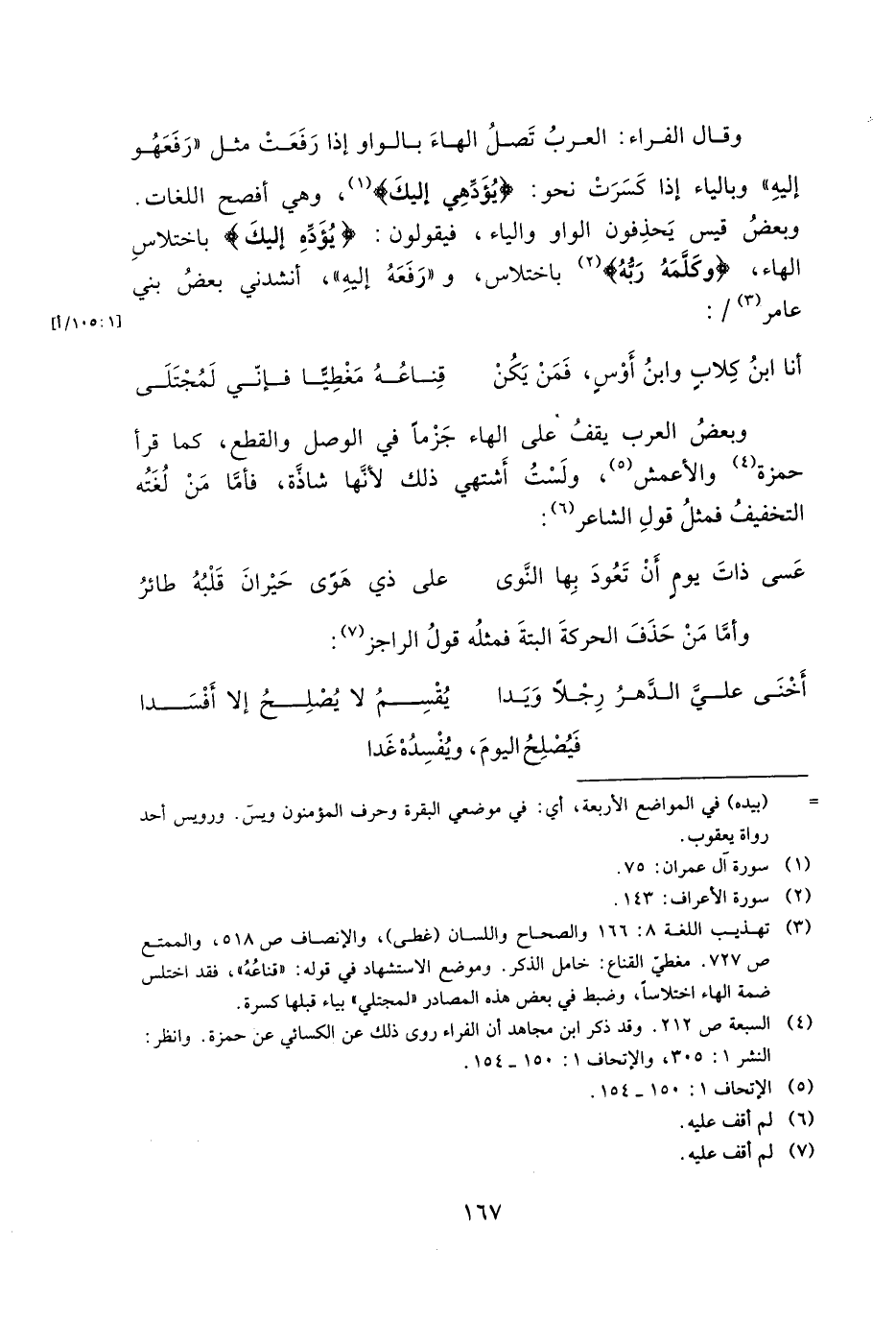 وبعض العرب يقف على الهاء جزماً في الوصل والقطع، كما قرأ حمزة والأعمش، ولست أشتهي ذلك لأنها شاذة فإما من لغته التخفيف فمثل قول الشاعر: